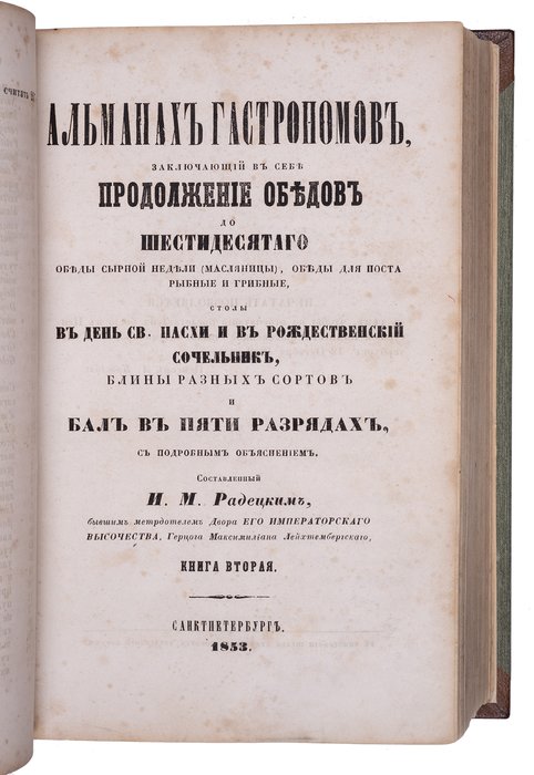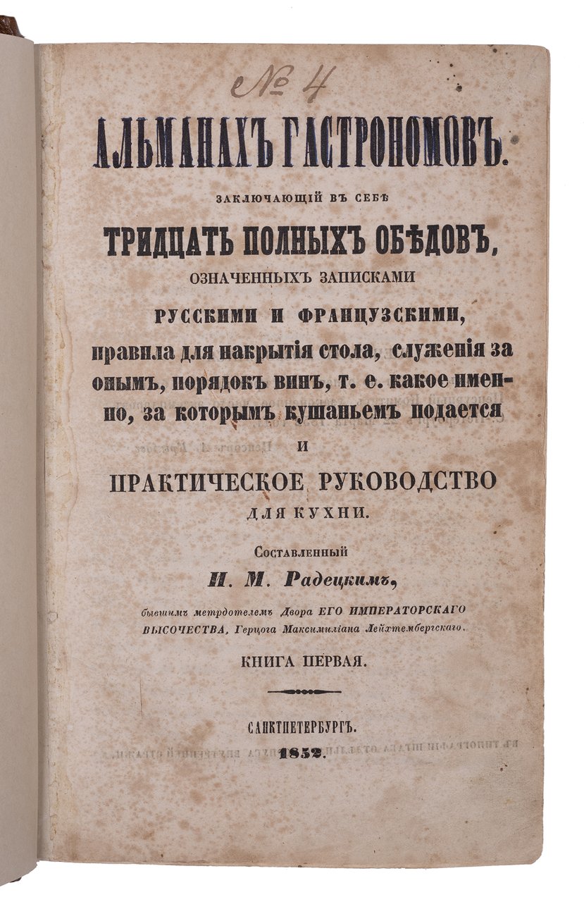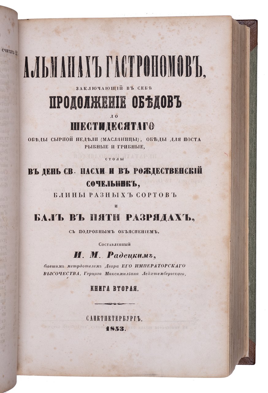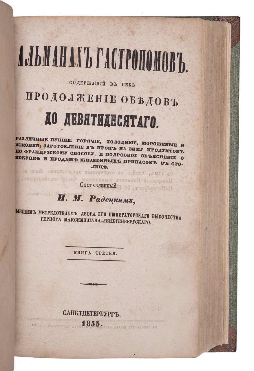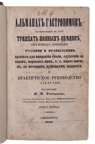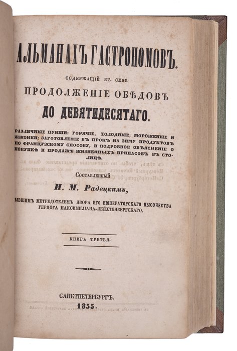 Радецкий И.М. Альманах гастрономов. Кн. 1-3. Санкт-Петербург: Типография Штаба Корпуса Внутренней Стражи, 1852–1855.