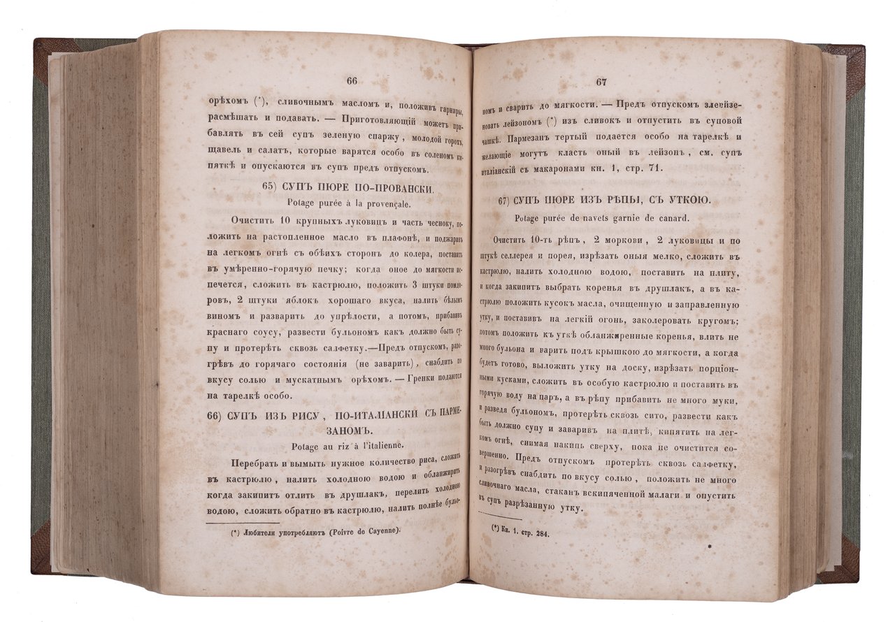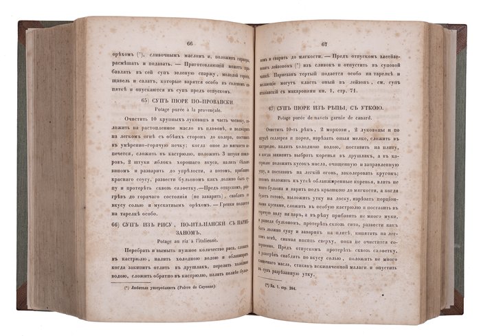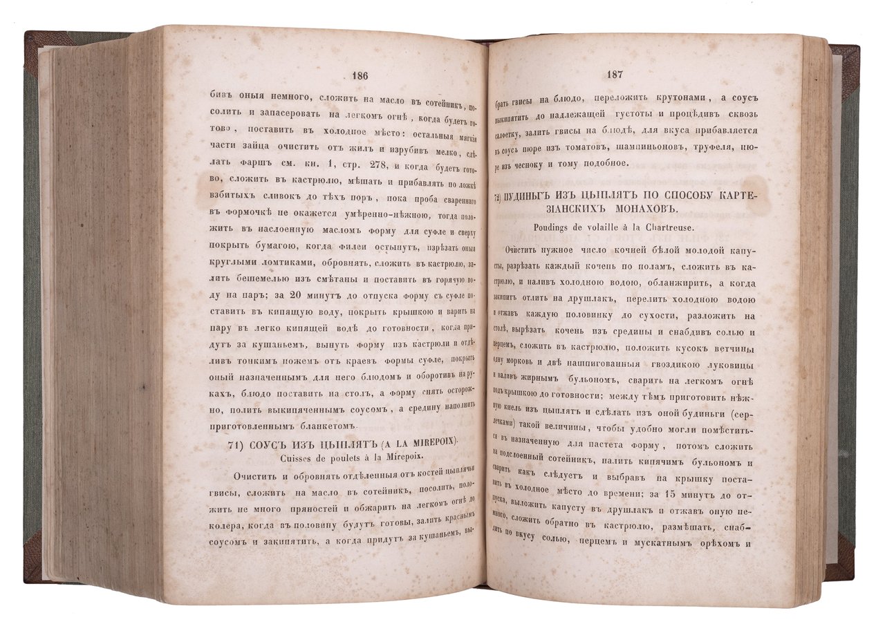 Примечательны тексты, помещенные перед рецептами: “Правила для накрытия стола, служения за оным, порядок вин”, “Устройство С.-Петербургской кухни”, “О людях для кухни”, “Замечание о провизии”.