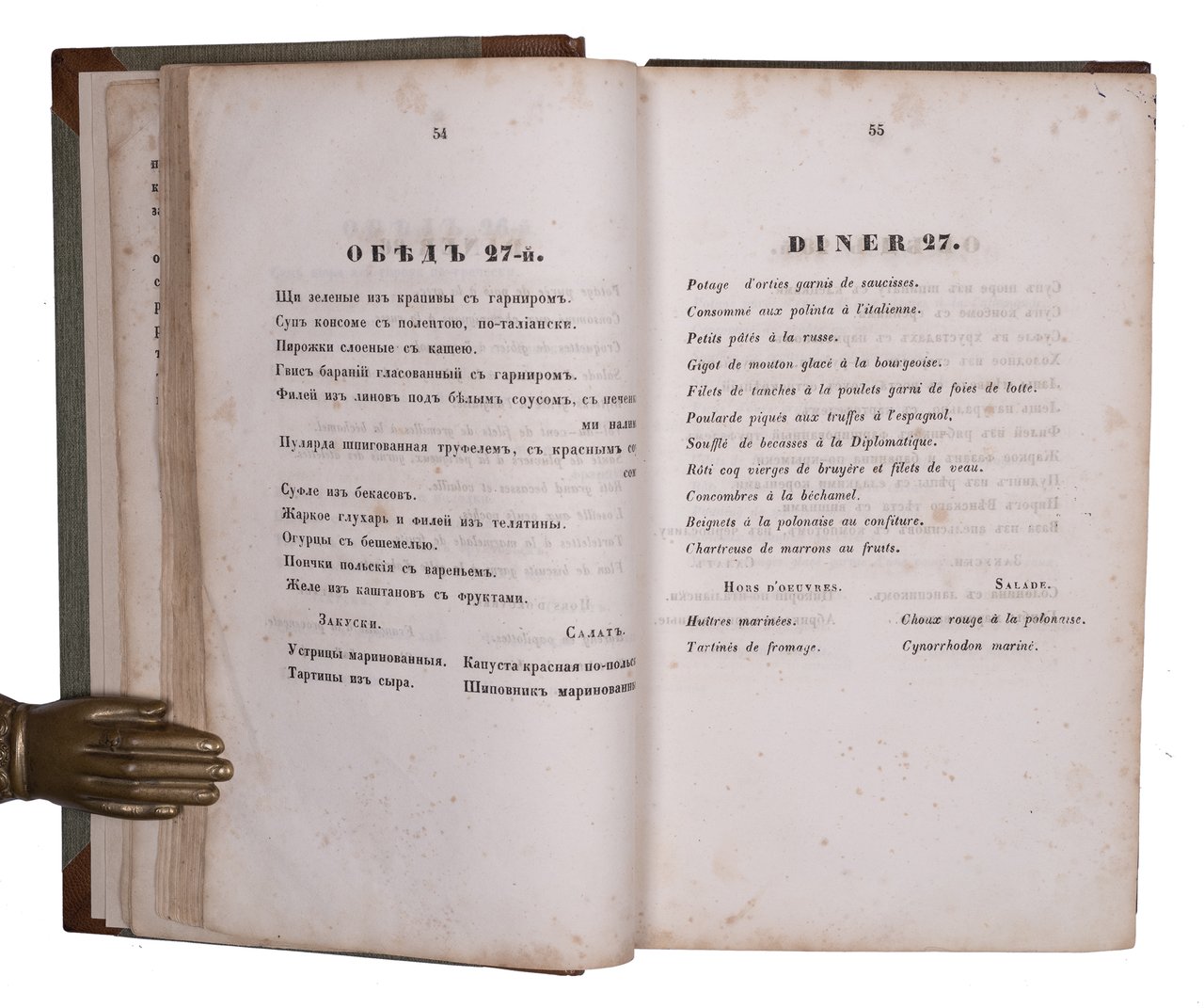 [Кн. 1:] заключающий в себе тридцать полных обедов, означенных записками русскими и французскими, правила для накрытия стола, служения за оным, порядок вин, т.е. какое именно, за которым кушанием подается и практическое руководство для кухни.