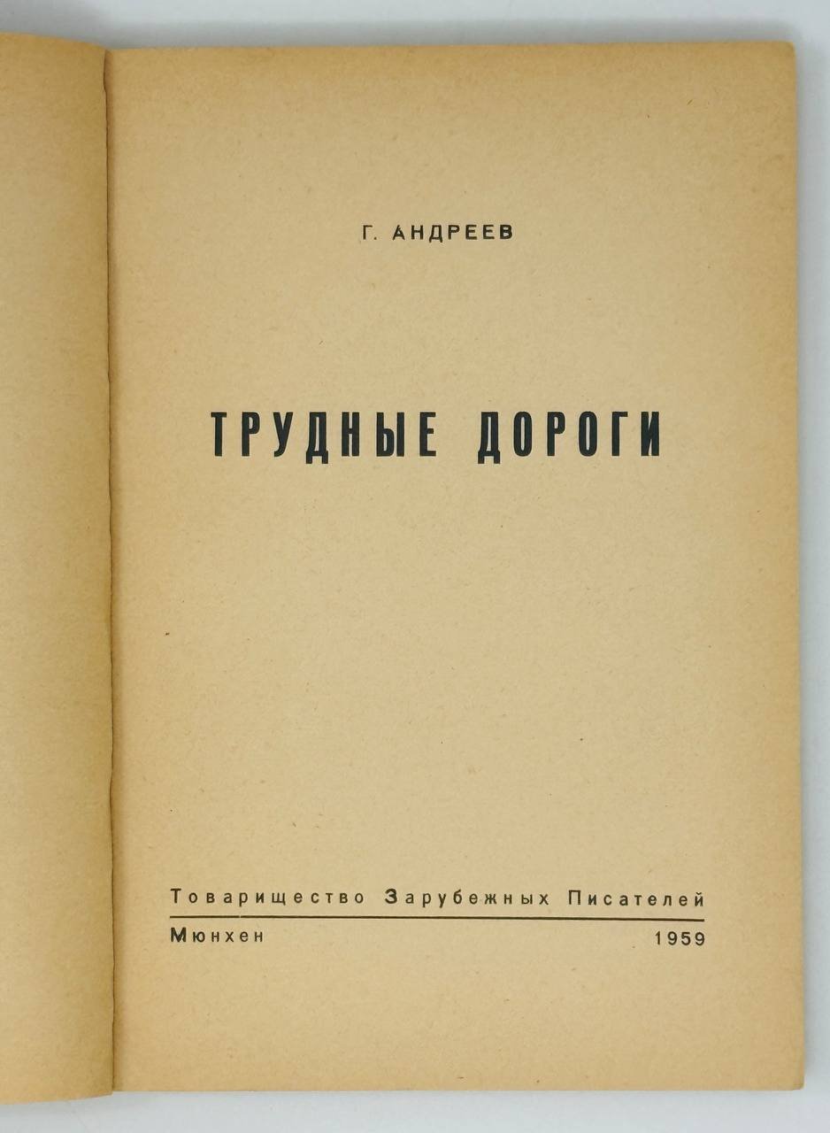 Андреев Г. Трудные дороги. Мюнхен: Товарищество Зарубежных Писателей, 1959. 157 с. 20,5х14,5 см.
