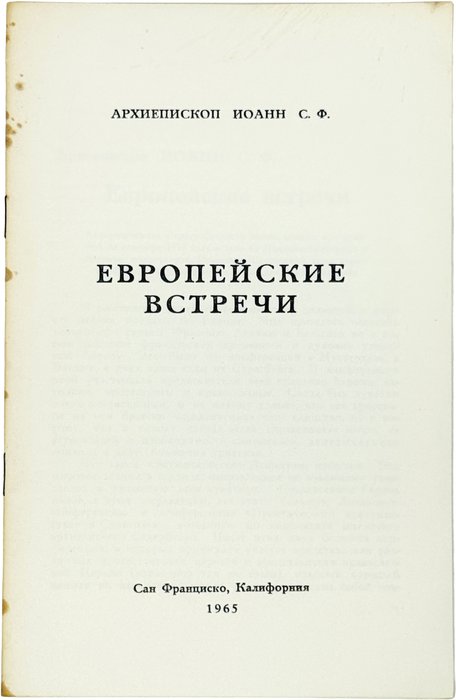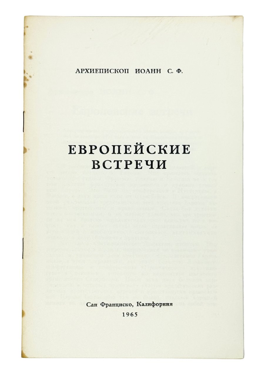 Архиепископ Иоанн (Шаховской). Европейские встречи. Сан-Франциско: 1965. 16 с. В шрифтовой издательской обложке.Архиепископ Иоанн (в миру князь Дмитрий Алексеевич Шаховской) (1902-1989) – епископ Православной церкви в Америке, архиепископ Сан-Францисский и Западно-Американский. Проповедник, писатель, поэт. Эмигрировал в Константинополь, потом во Францию. Публиковал стихи под псевдонимом «Странник».