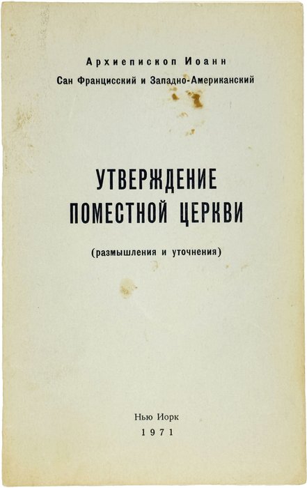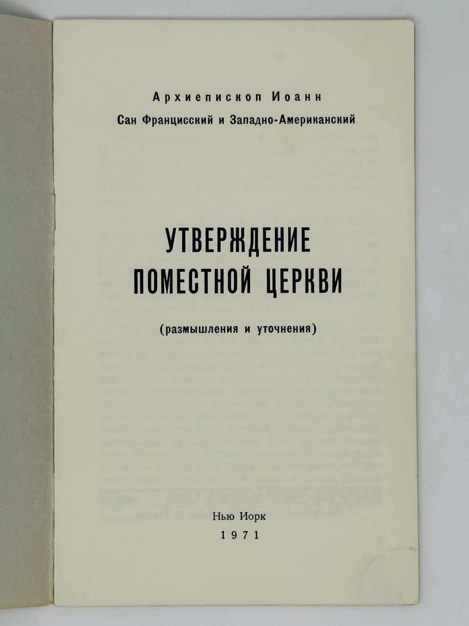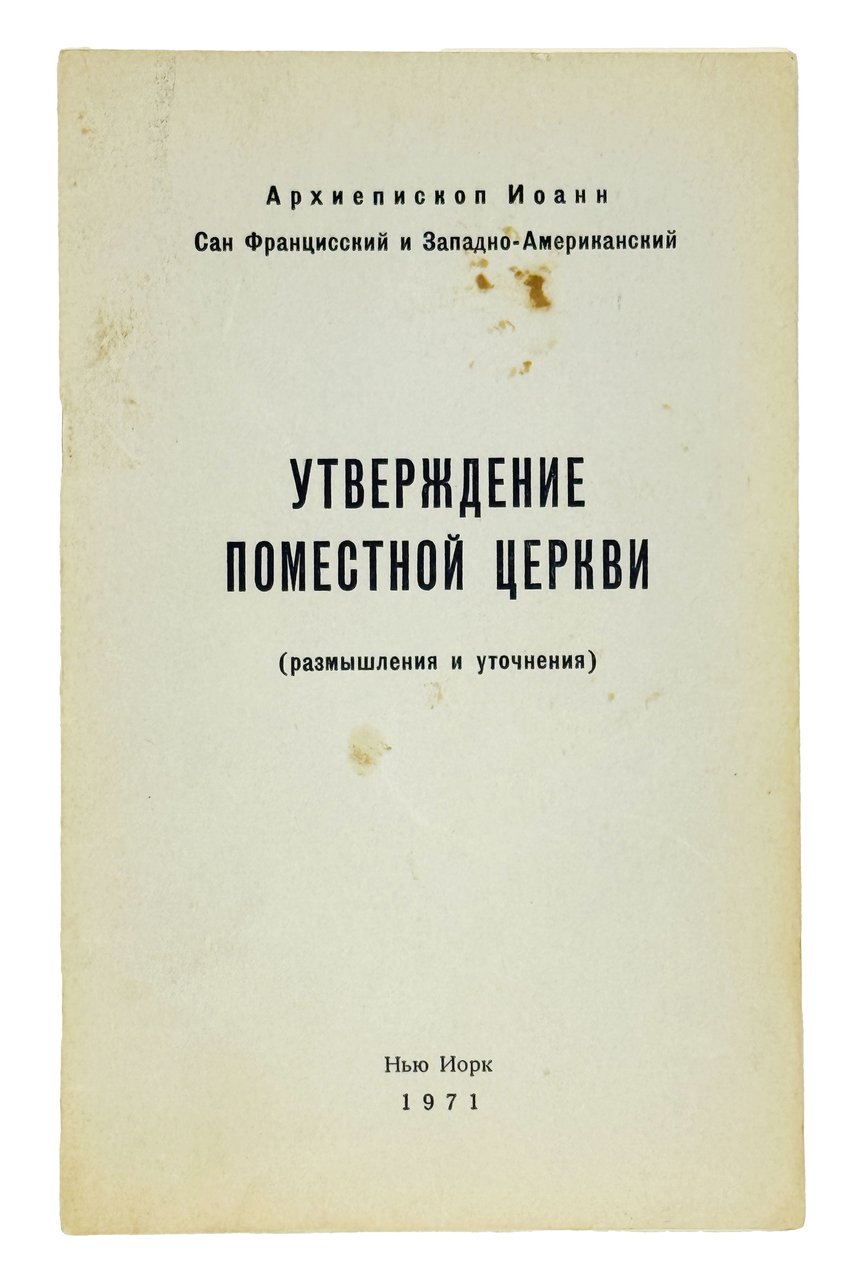 Архиепископ Иоанн (Шаховской). Утверждение поместной церкви (размышления и уточнения). Нью-Йорк: Waldon Press, 1971. 24 с. В шрифтовой издательской обложке.