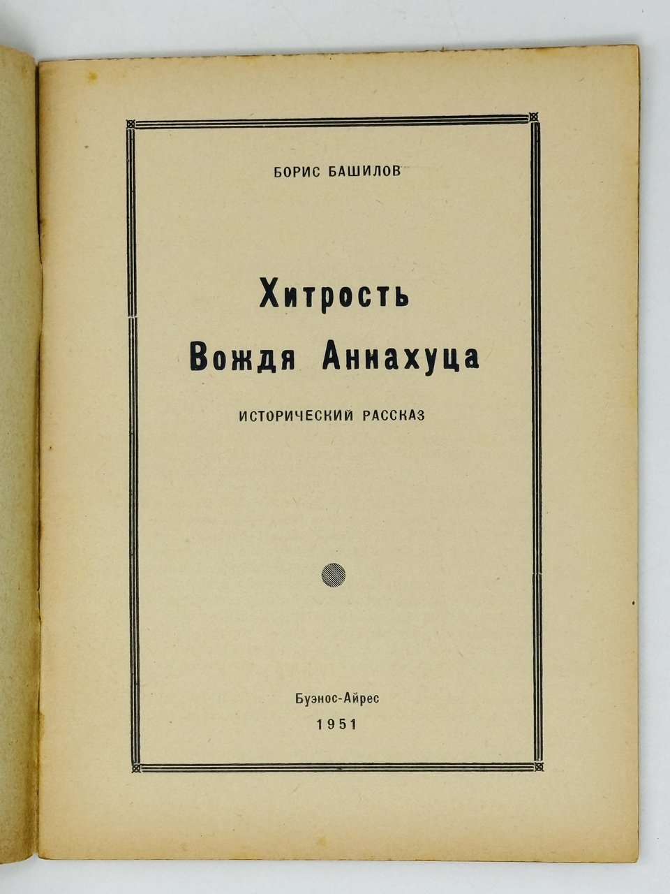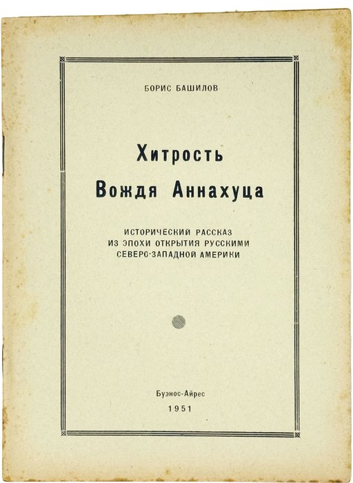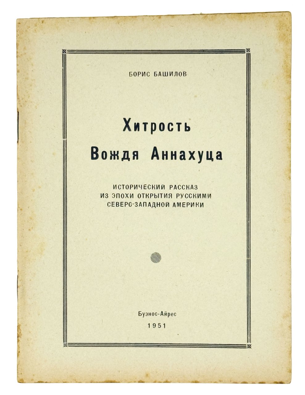 Башилов Б. Хитрость вождя Аннахуца. Исторический рассказ из эпохи открытия русскими Северо-Западной Америки. Буэнос-Айрес: Русь, 1951. 29, [1] с. 19,5х14,5 см.