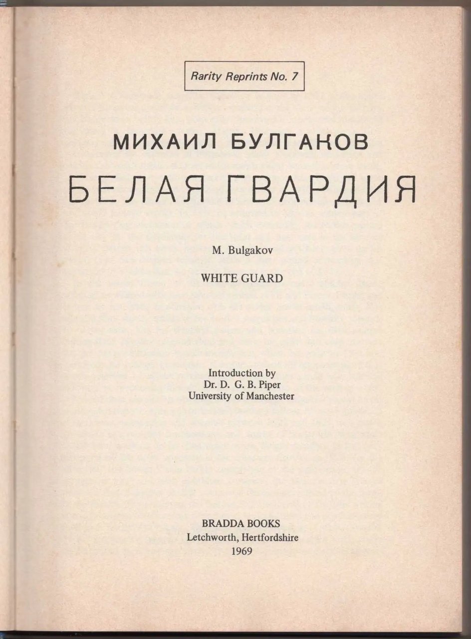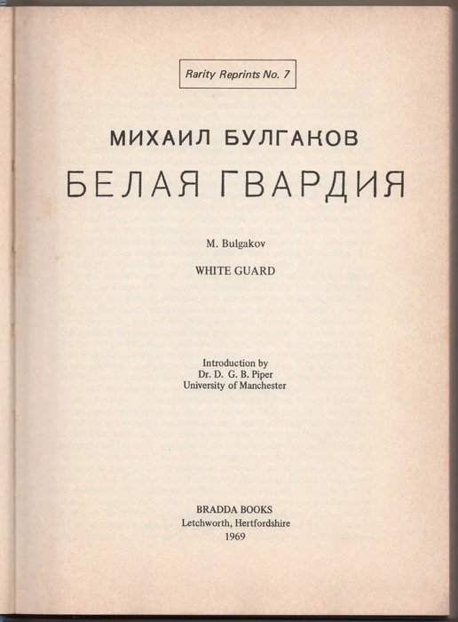 Булгаков, М. Белая гвардия / вступительная статья профессора Манчестеровского Универитета Д.Пайпера. Летчуэрт (Великобритания): Bradda Books, 1969.