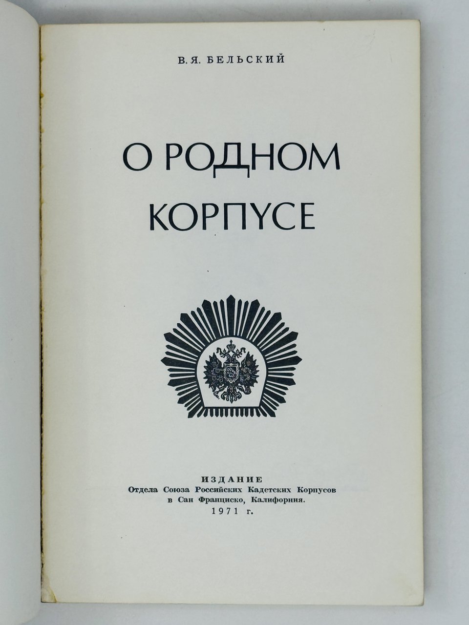Бельский В.Я. О родном корпусе. Сан-Франциско: Издание Отдела Союза российских Кадетских Корпусов в Сан-Франциско, Калифорния, 1971. 195 с.: ил. 20,5х13,5 см.