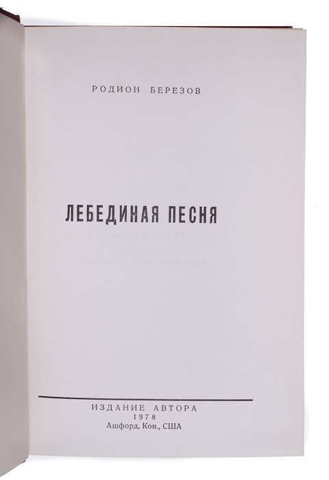 Березов Р. Лебединая песня. Ашфорд (штат Коннектикут, США): Издание автора, 1978. 314, [3] с.: портр. 21х14,5 см.