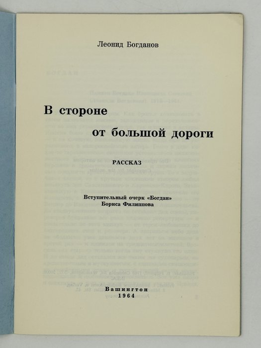 Богданов Л. В стороне от большой дороги. Рассказ. Вашингтон: Б.Филиппов. 1964. 28 с.