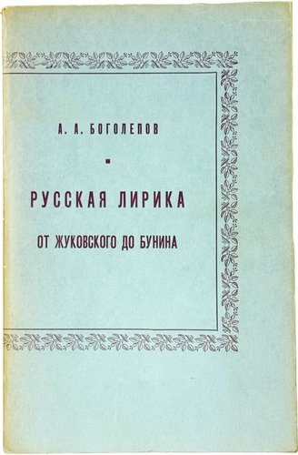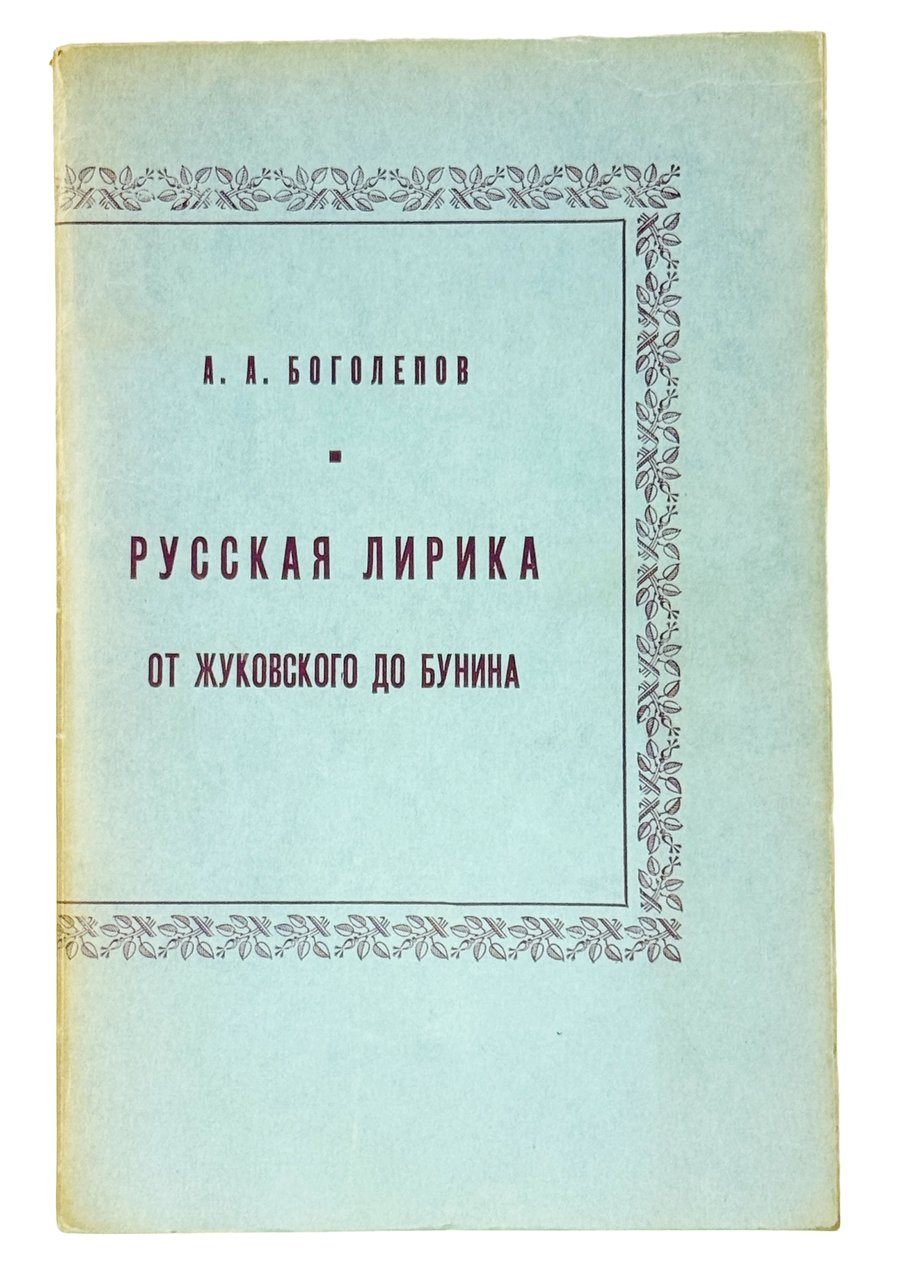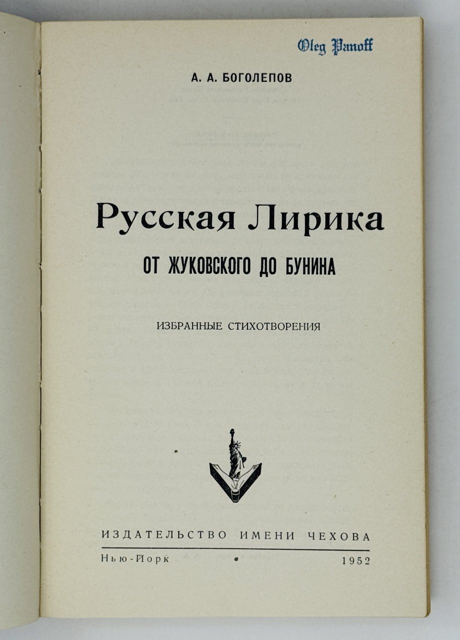 Боголепов А. Русская лирика от Жуковского до Бунина: Избранные стихотворения. Нью-Йорк: Издательство имени Чехова, 1952. 408, [6] с. 21,5х14 см.