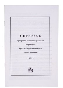 Список архиереев, священнослужителей и приходов Русской Зарубежной Церкви с их адресами. 1993 г. Джорданвиль: Книгопечатня преп. Иова Почаевского, 1993.
