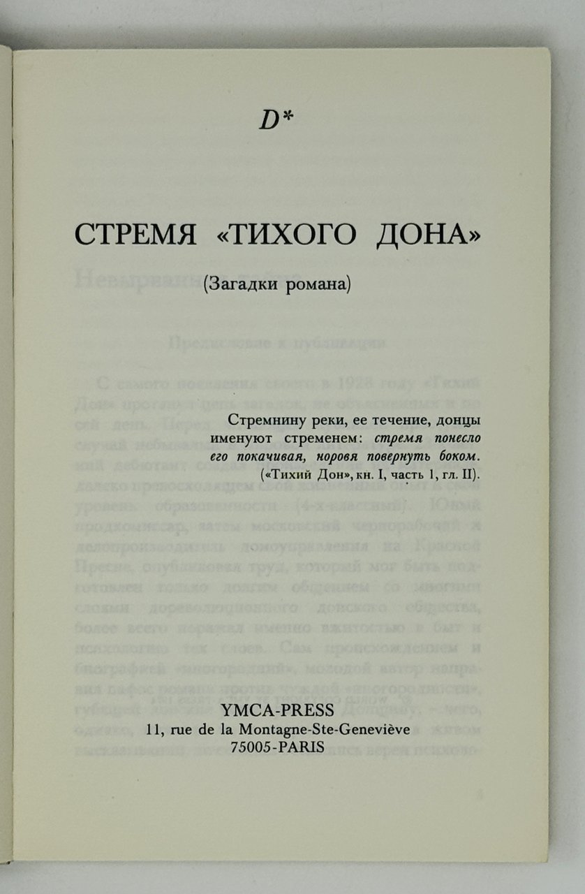 D*. Стремя «Тихого Дона»: (Загадки романа). Париж: YMCA-Press, 1974. 195 с. 18х12 см.