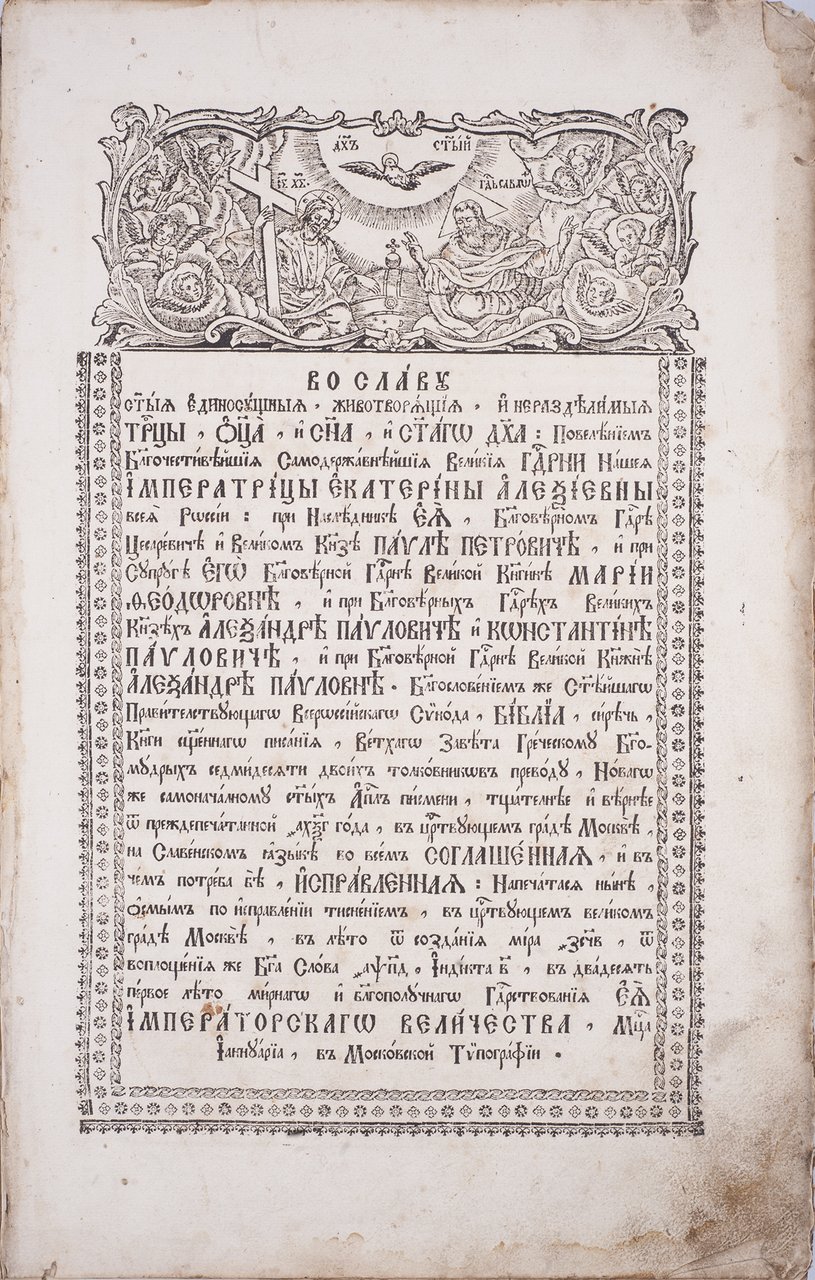 Библия сиречь книги Священного писания Ветхого и Новаго Завета. Москва: Синодальная типография, 1784. [1], 38, 224 л. 42х27 см.