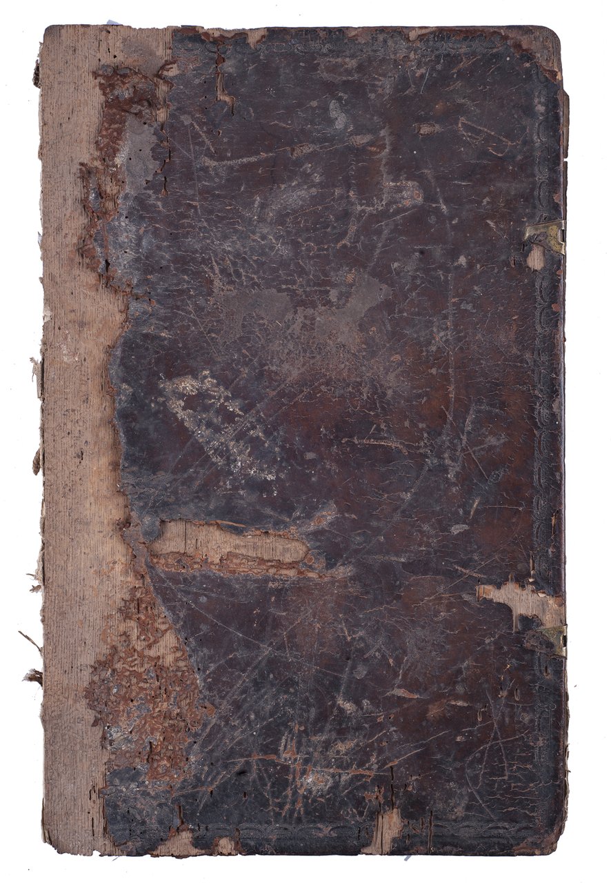 Крышки от цельнокожаного переплета эпохи. Корешок отсутствует. Блок в хорошем состоянии. Утрата фрагментов кожи с крышек. Без титульного листа, текст заканчивается на листе 224 (окончание книги Иова). Гравированные сюжетные заставки, предваряющие каждую следующую книгу Библии.
