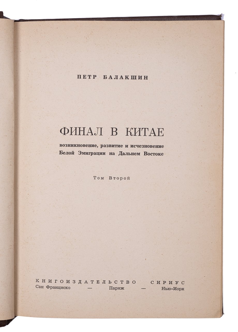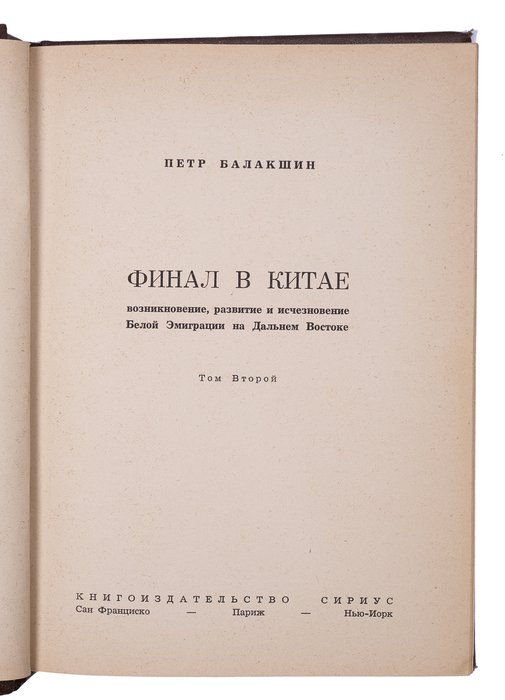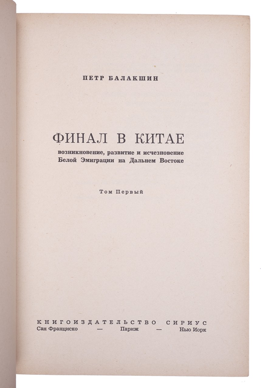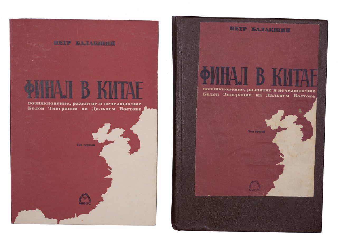 Балакшин П. Финал в Китае: Возникновение, развитие и исчезновение Белой Эмиграции на Дальнем Востоке. В 2 томах. Сан-Франциско, Париж: Нью-Йорк: Книгоиздательство «Сириус», 1958-1959. 430, 374 с. 21х15 см.