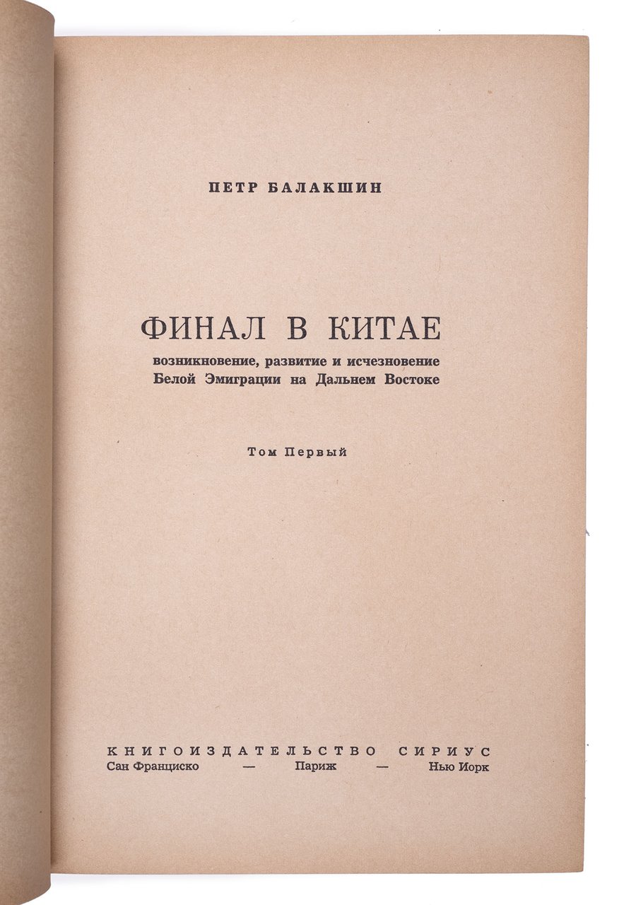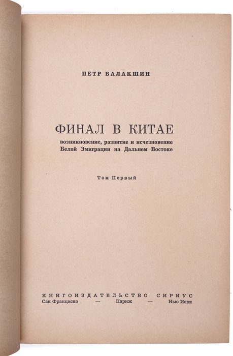 Балакшин П. Финал в Китае : Возникновение, развитие и исчезновение Белой Эмиграции на Дальнем Востоке. Т.1. Сан-Франциско - Париж - Нью-Йорк: Сириус, 1958. 430 с. 21х14,5 см.