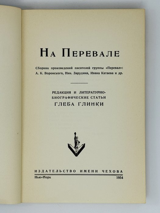 На перевале: Сборник произведений писателей группы «Перевал» / Ред. и лит.-биогр. статьи Г. Глинки. Нью-Йорк: Издательство имени Чехова, 1954. 412, [2] с. 21,5х14 см.