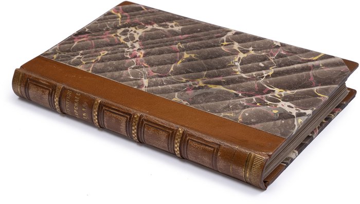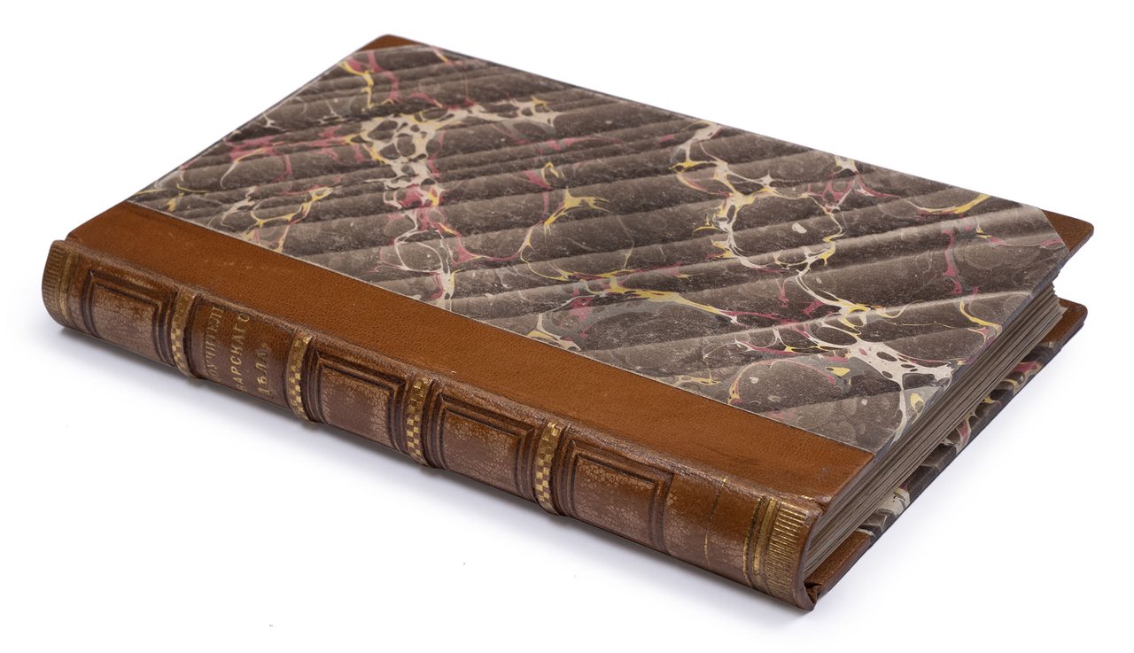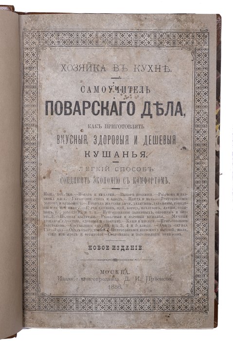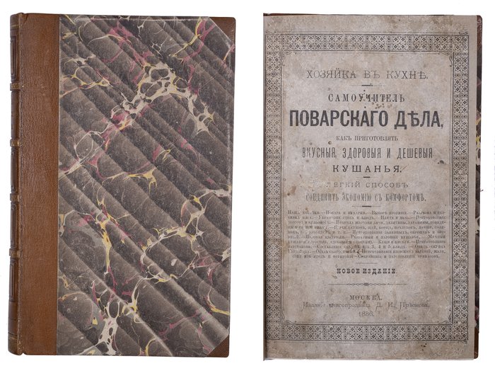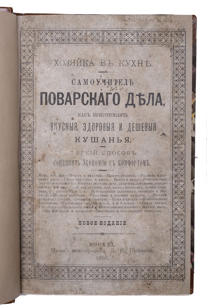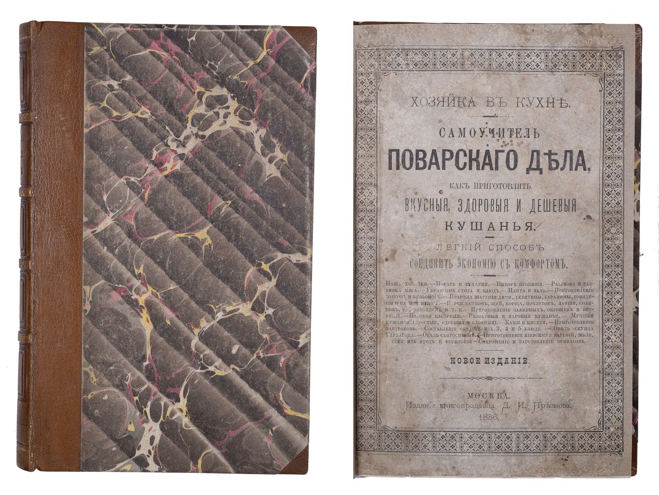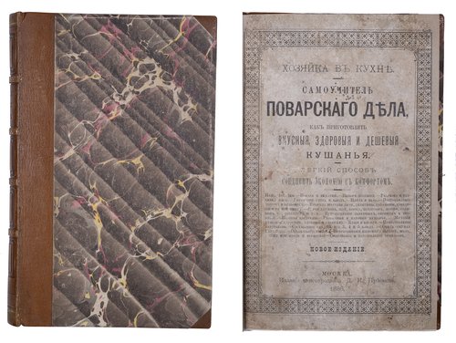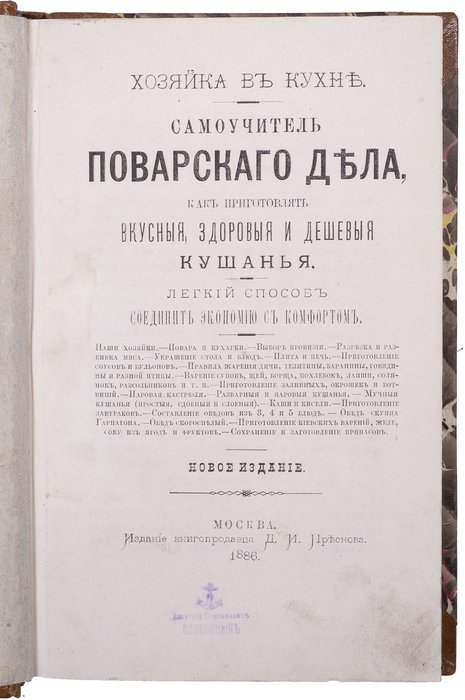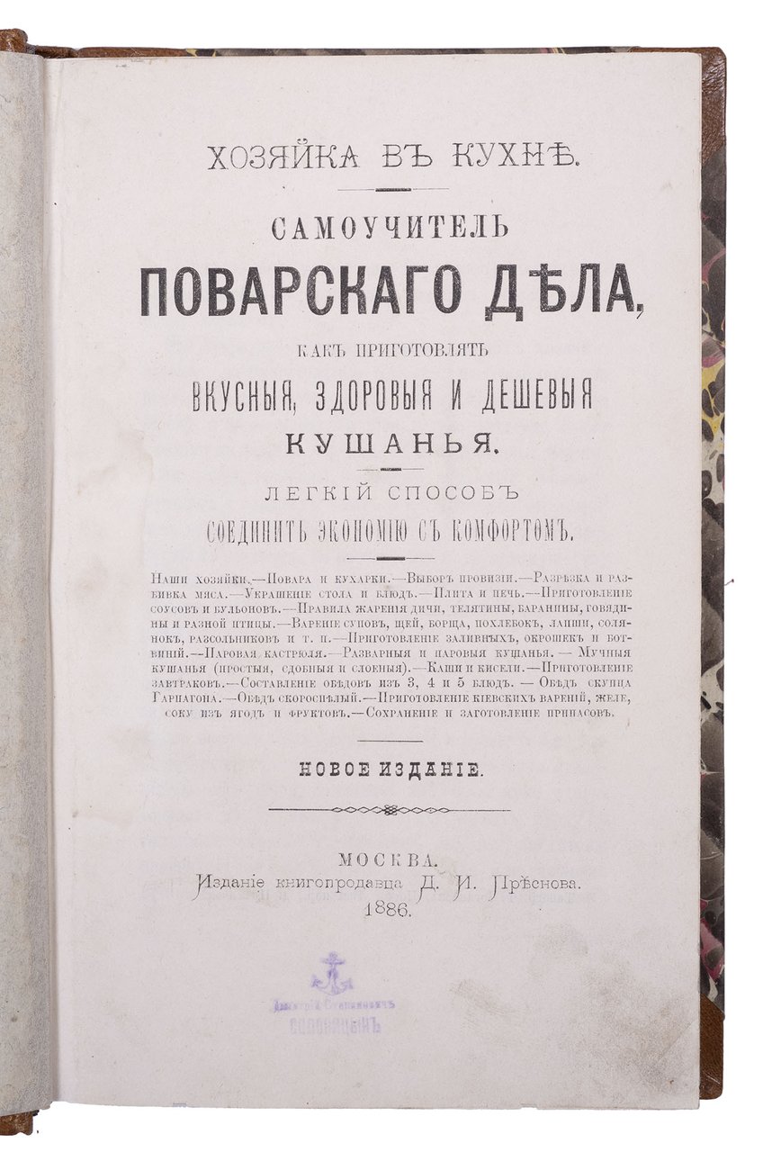 Хозяйка в кухне. Самоучитель поварского дела, как приготовлять вкусные, здоровые и дешевые кушанья. Легкий способ соединить экономию с комфортом. Новое издание. Москва: Д.И. Преснов, 1886. [2], XVI, 400, XII с., 4 л. ил. 22,5х15 см. Во владельческом полукожаном переплете с золотым тиснением по корешку; передняя сторонка издательской обложки сохранена. Новые форзацы. Реставрация изд. обложки и краев некоторых страниц, загрязнение страниц по нижнему полю (от перелистывания), владельческие штампы на титульном и следующем листах, в остальном очень хорошее состояние.