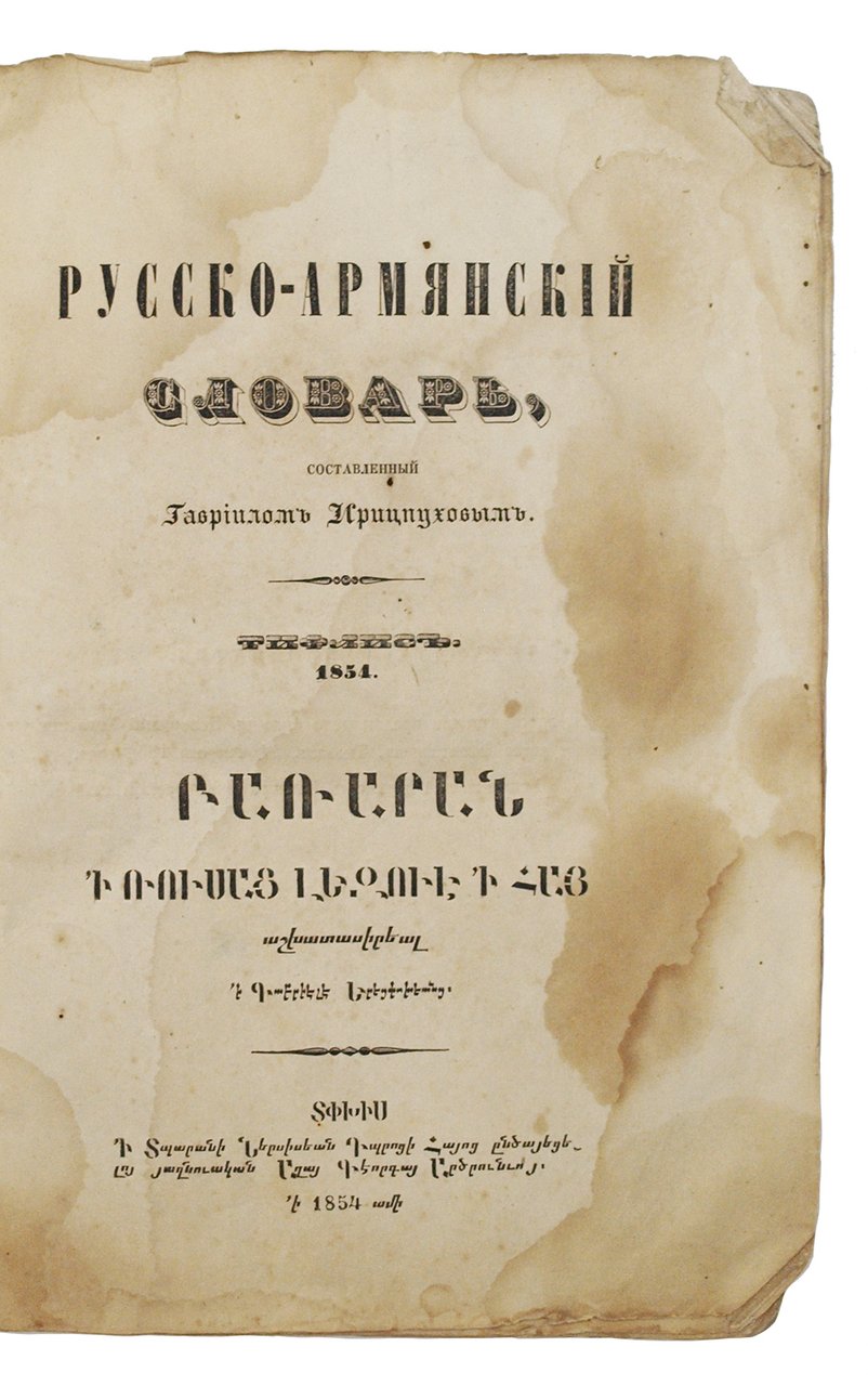 Русско-армянский словарь / сост. Гавриил Ирицпухов. Тифлис, 1854. [14], 584, [12] с. 26,5х18 см.