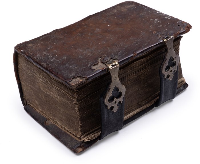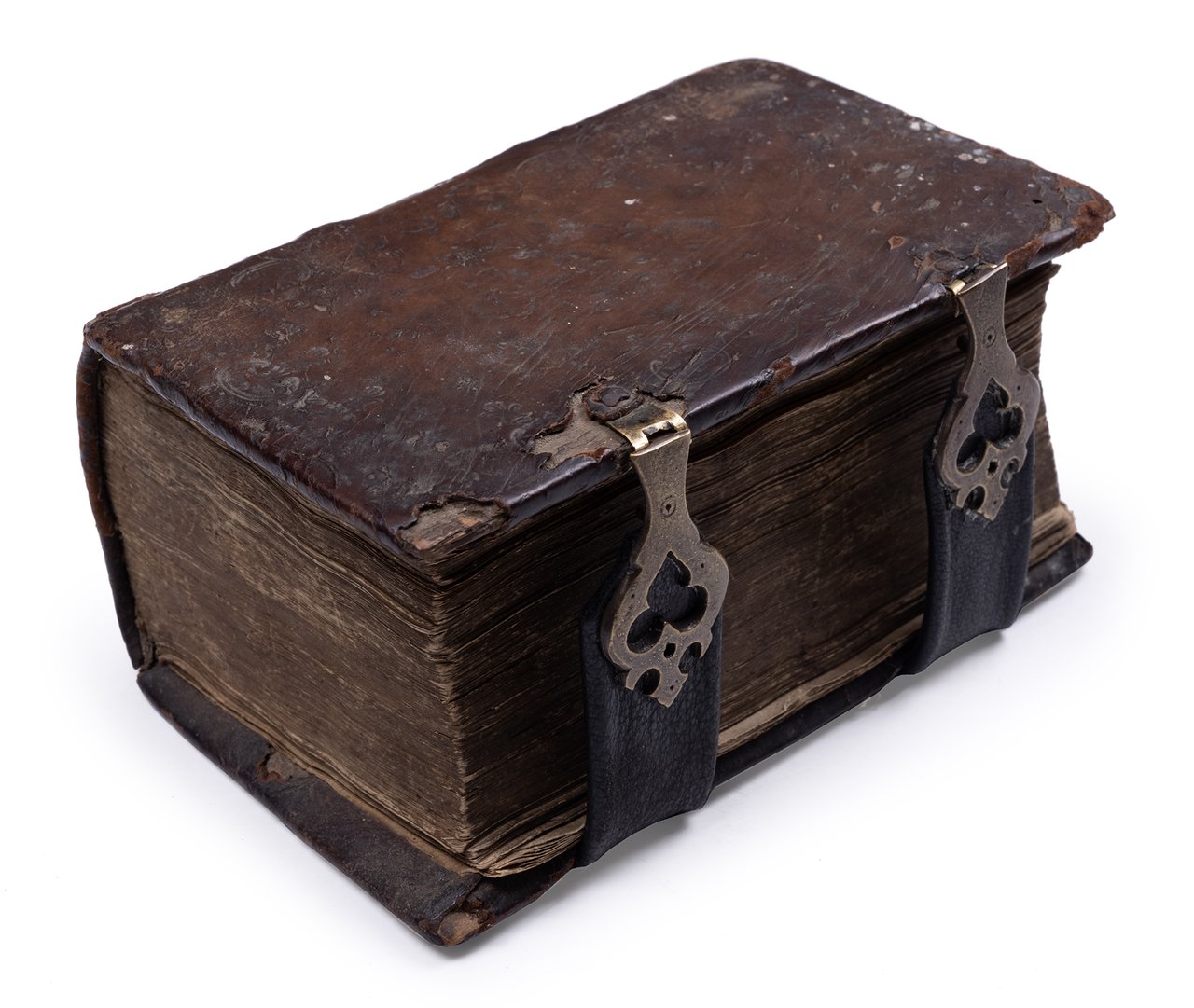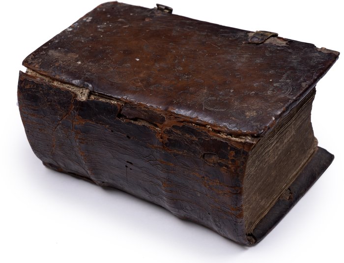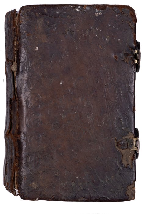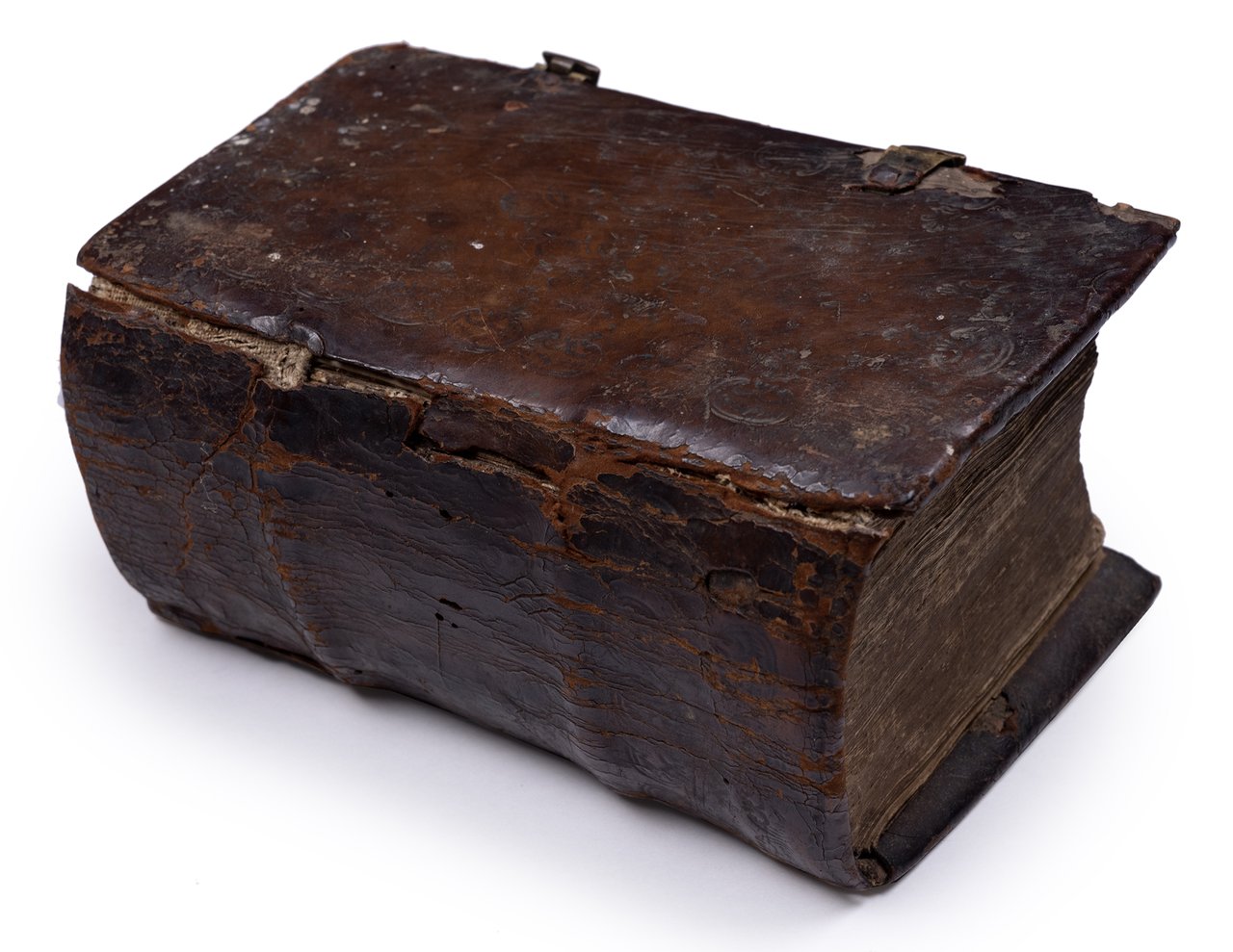 Поновленные застежки. Утрата фрагментов кожи с переплета, надрывы вдоль корешка, несколько маленьких пятен на передней крышке. Загрязнение листов от перелистывания, местами множество пятен, разлом блока перед последней тетрадью, несколько листов впереди подклеены по корешковому полю, на одном листе бумажная заплатка дырочки (с утратой нескольких букв на 1й стороне. В остальном блок крепкий.