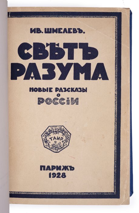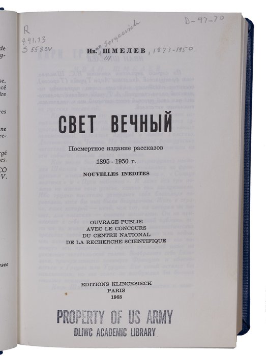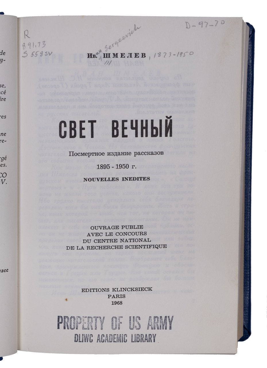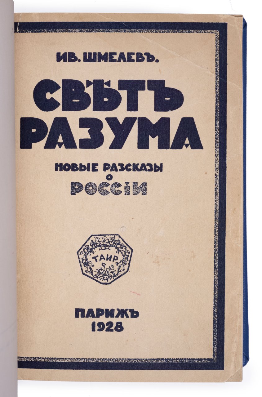 [Конволют] Шмелев И. 1) Свет вечный. Посмертное издание рассказов. 1895-1950. Nouvelles inedites / Вступительная статья А. Труайя. Париж: Klincksieck, 1968. 379 с., 2 л. ил.; 2) Свет разума. Новые рассказы о России. Париж: Таир, [1928]. 173 с.; 3) Памяти Ивана Сергеевича Шмелева. Сборник / Под. редакцией В.А. Маевского. Мюнхен, 1956. 127 с. 20х14,5 см.