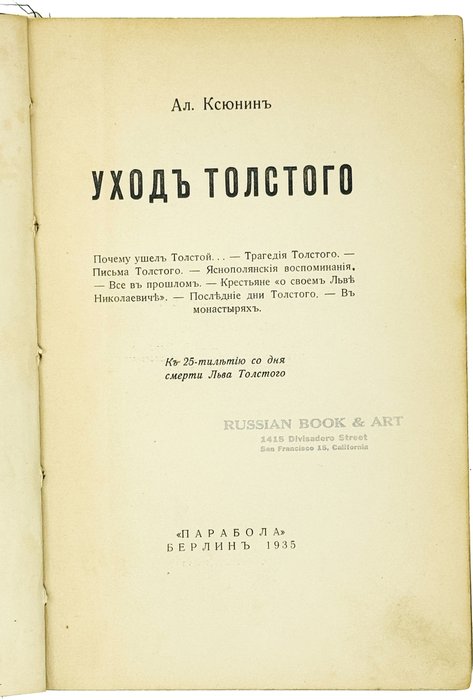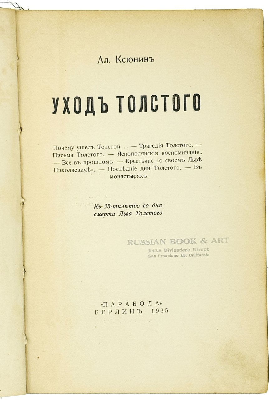 Ксюнин А. Уход Толстого. Берлин: Парабола, 1935. 96 с.: ил. 23х15 см.