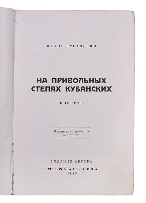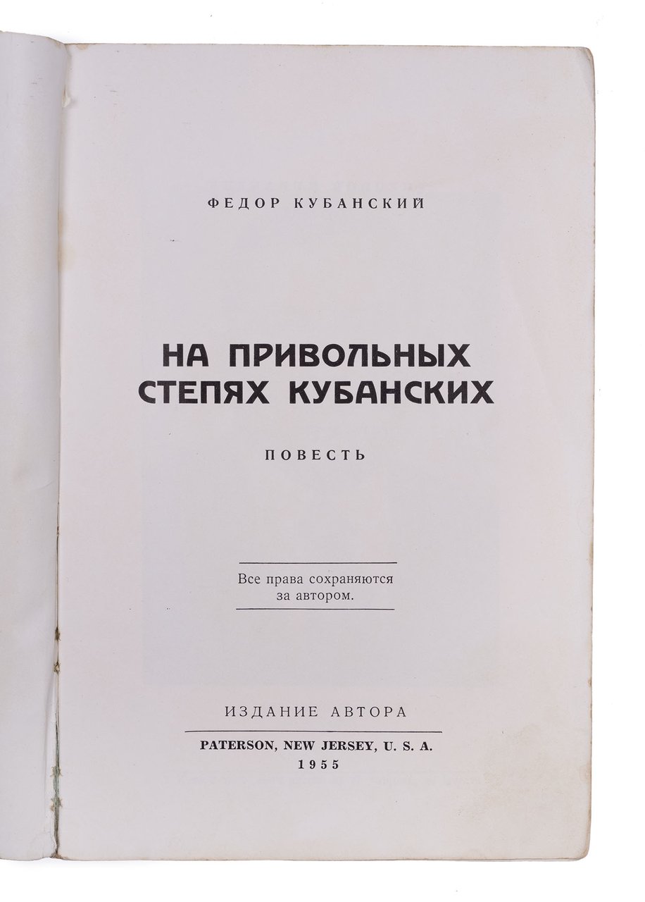 Кубанский Ф. На привольных степях кубанских : Повесть. Патерсон (штат Нью-Джерси, США), 1955. 442 с. 21,5х14,5 см.