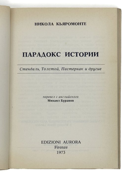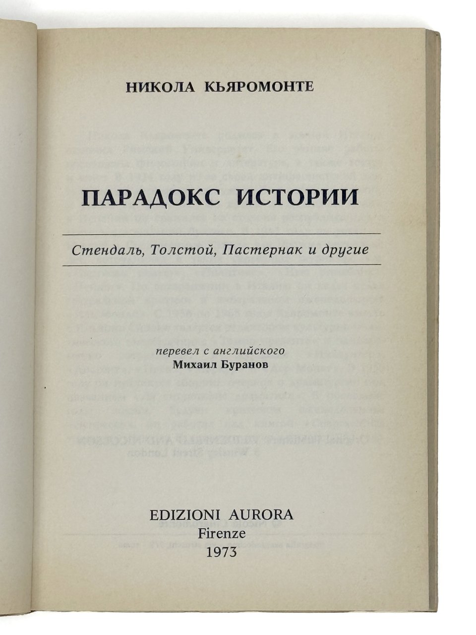 Кьяромонте Н. Парадокс истории: Стендаль, Толстой, Пастернак и другие / Пер. с англ. М. Буранов. Флоренция: Edizioni Aurora, 1973. 205 с. 16х11 см.