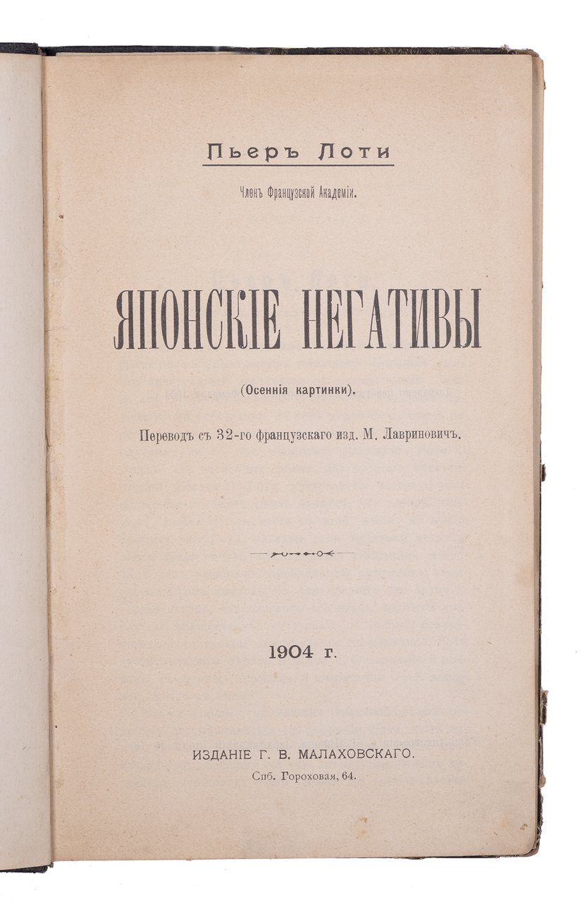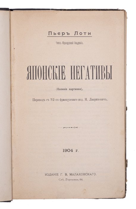 Вио Л. Японские негативы: (Осенние картинки) / Пьер Лоти; Пер. с 32-го фр. изд. М. Лавринович. СПб.: Г.В. Малаховский, 1904. 204 с. 21,5х13,5 см.