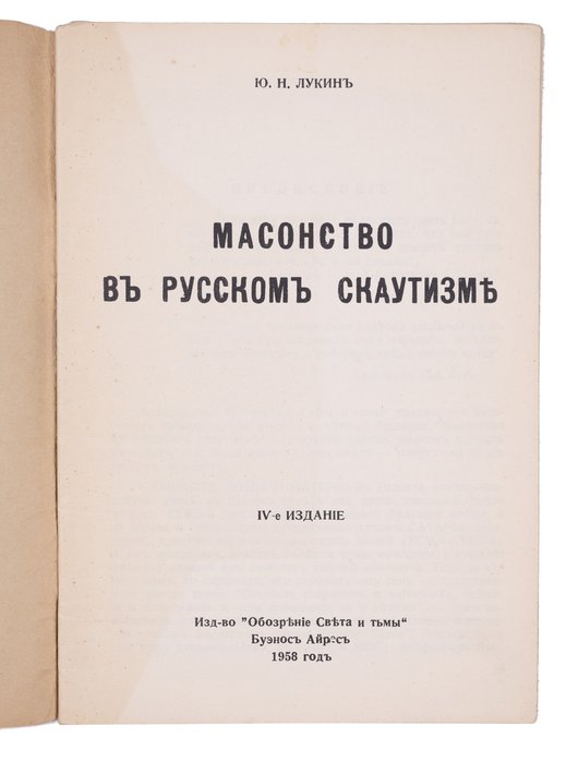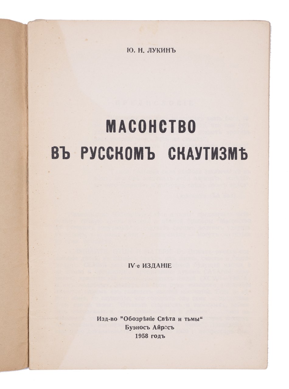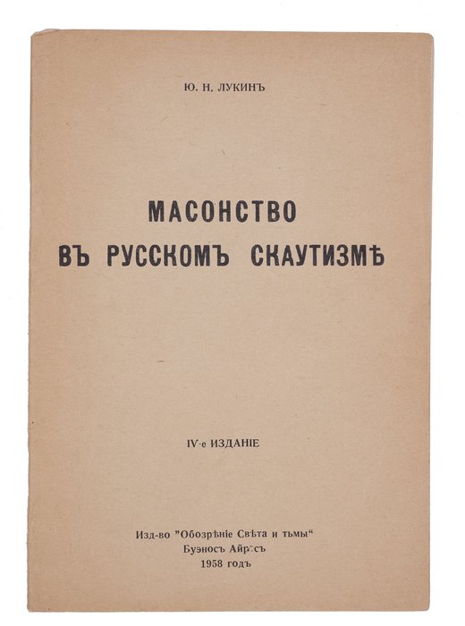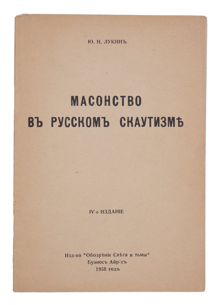 Лукин Ю. Масонство в русском скаутизме. IV-е издание. Буэнос-Айрес: Изд-во «Обозрение света и тьмы», 1958. 30 с.: ил. 20х14 см.