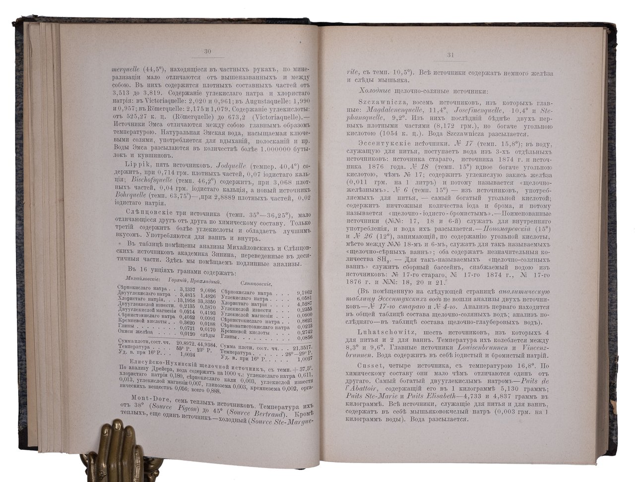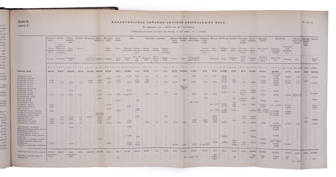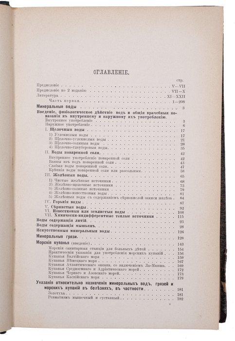 В данной книге воды были сгруппированы по химическому составу. Так врачи того времени могли использовать путеводитель для подбора лечебного курорта, выбирая между аналогичными вариантами. Воды разделены на семь групп, внутри которых выделены классы. Грязи и морские купания составляют отдельные главы. Обширная библиография включает русские и иностранные источники. В конце книги дан алфавитный указатель.