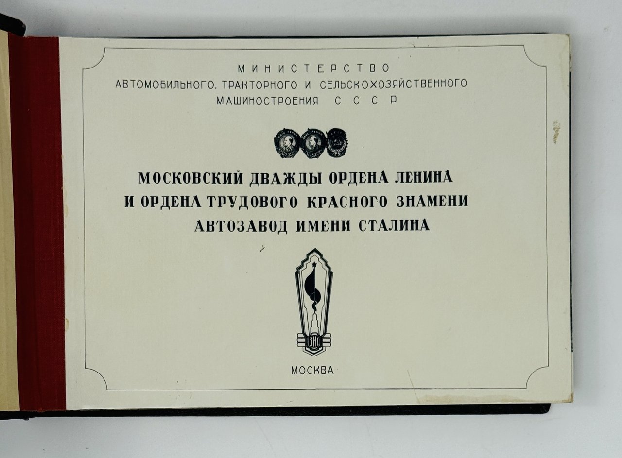 Московский дважды ордена Ленина и ордена Трудового Красного Знамени Автозавод имени Сталина. М.: Министерство Автомобильного, Тракторного и Сельскохозяйственного Машиностроения СССР, [1949]. [38] c. 16х22 см. В коленкоровом переплете эпохи.