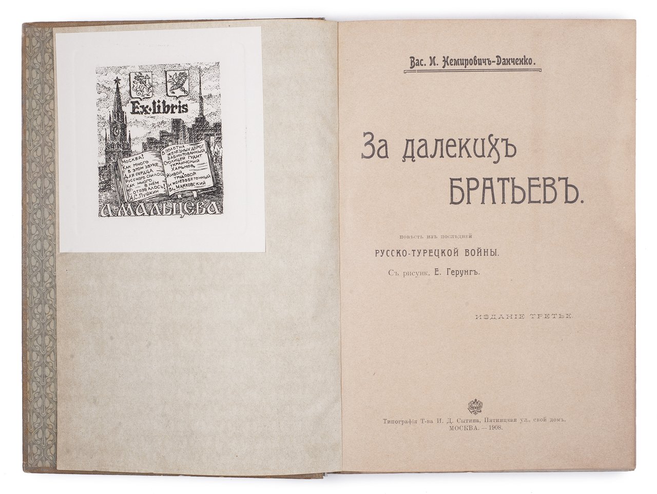 Немирович-Данченко В.И. За далеких братьев : Повесть из последней русско-турецкой войны. Москва: Тип. Т-ва И.Д. Сытина, 1908. 175 с.: ил. 22,5х15,5 см.