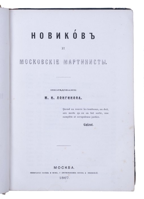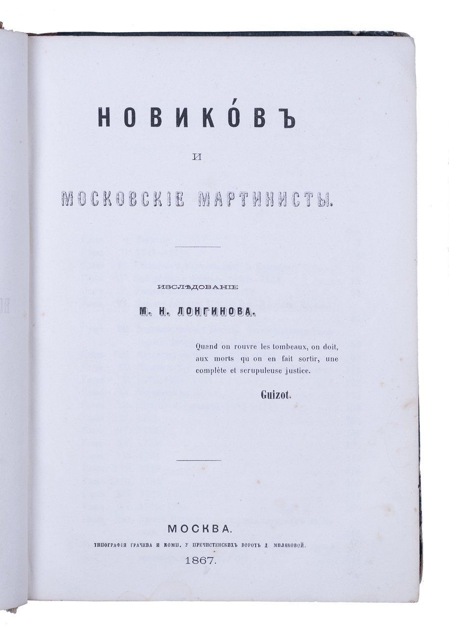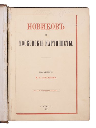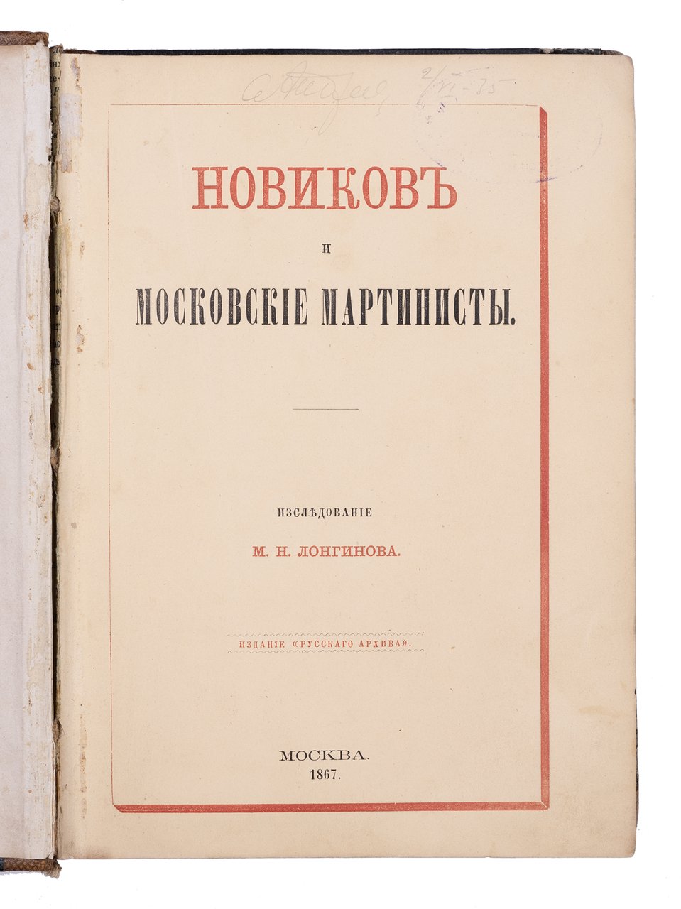 Лонгинов М. Н. Новиков и московские мартинисты. Москва: типография Грачева и К°, 1867. [4], IV, 384, [3], 04–0176 с. 22,5х16,5 см. В составном переплете эпохи с сохранением издательской обложки. Потертости переплета, разломы между форзацем и блоком, и между с. 0174–0175, след от мытого штампа на обложке, с. 5, пара пятен на задней сторонке обложки, в остальном хорошее состояние. Провенанс: из частной профессорской библиотеки в США, штамп владельца на нахзаце.