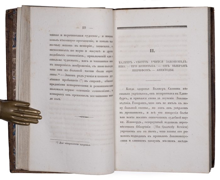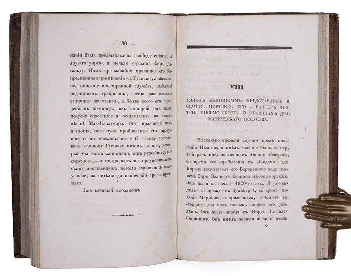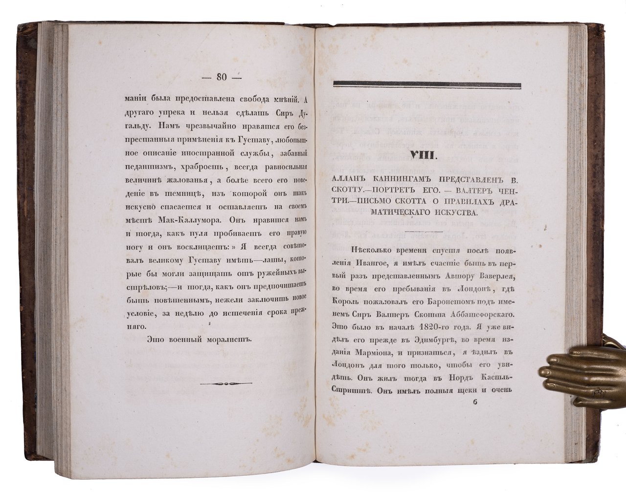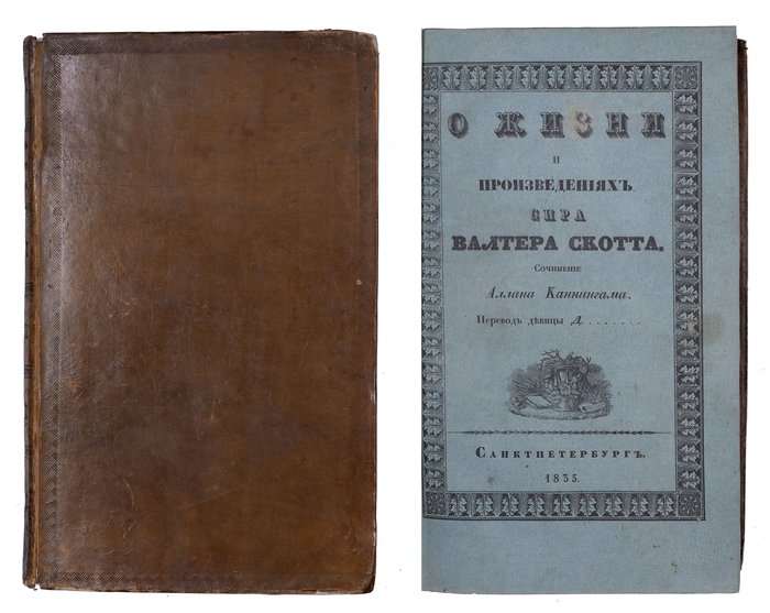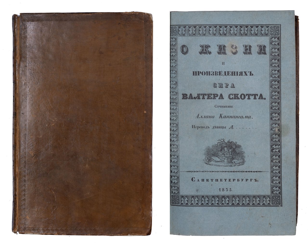 Каннингам А. О жизни и произведениях сира Валтера Скотта. СПб.: В тип. Конрада Вингебера, 1835. XLVIII, 143, [5] с. 22х14 см. В цельнокожаном переплете эпохи с декором и тисненым названием на корешке; форзацы из мраморной бумаги. Сохранены обе сторонки издательской обложки с виньетками. Потертости переплета и сбитые уголки, местами лисьи пятна, На с. 3 конгревным тиснением владельческий гербовый экслибрис, владельческие пометы «Из б-ки Г.А. Гуковского» и комментарий про перевод на обороте обложки. Григорий Александрович Гуковский (1902–1950, репрессирован) — советский специалист по русской литературе XVIII века, литературовед и критик, профессор, доктор филологических наук.