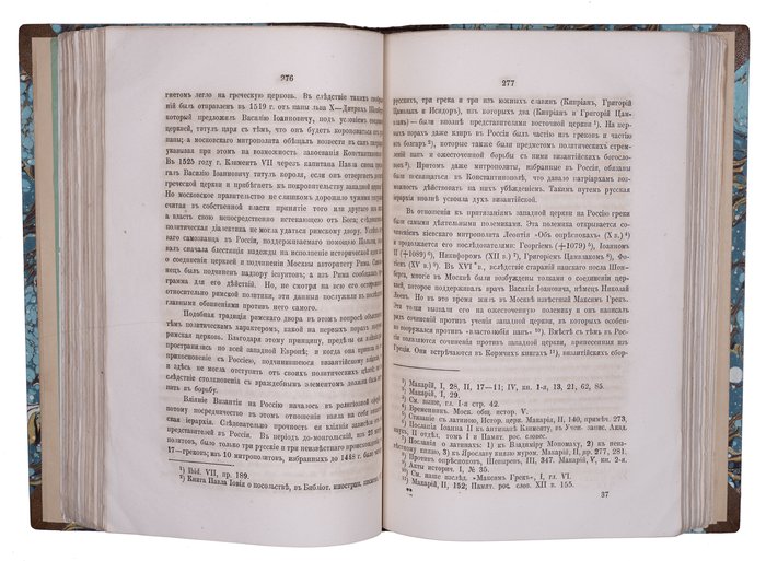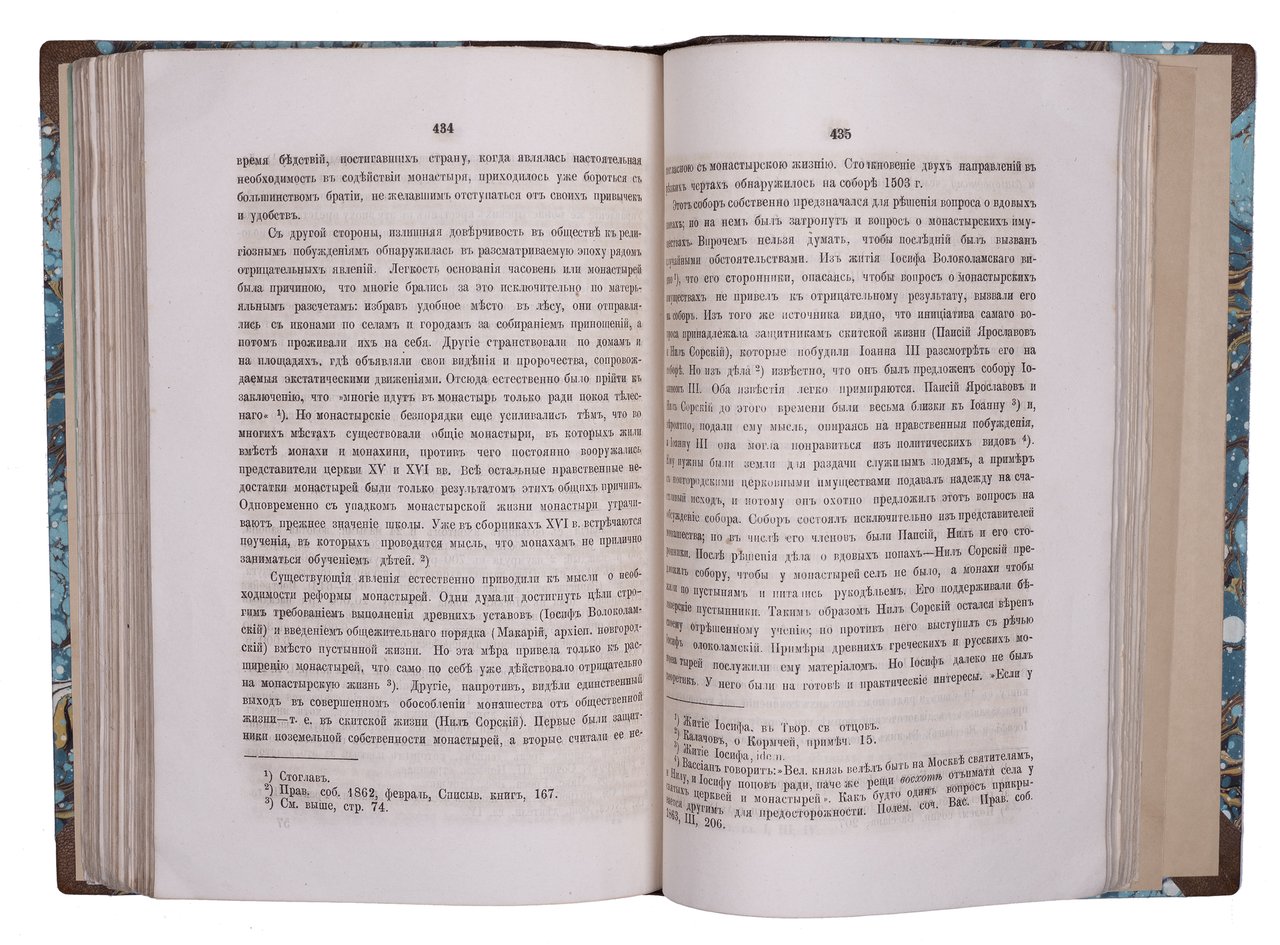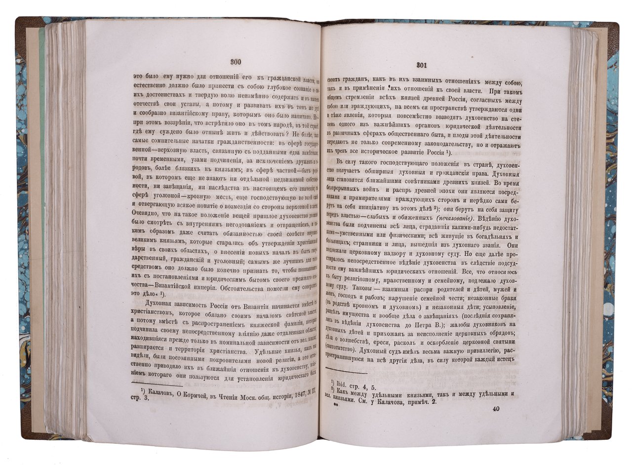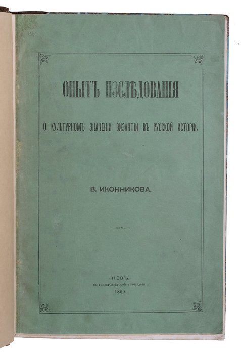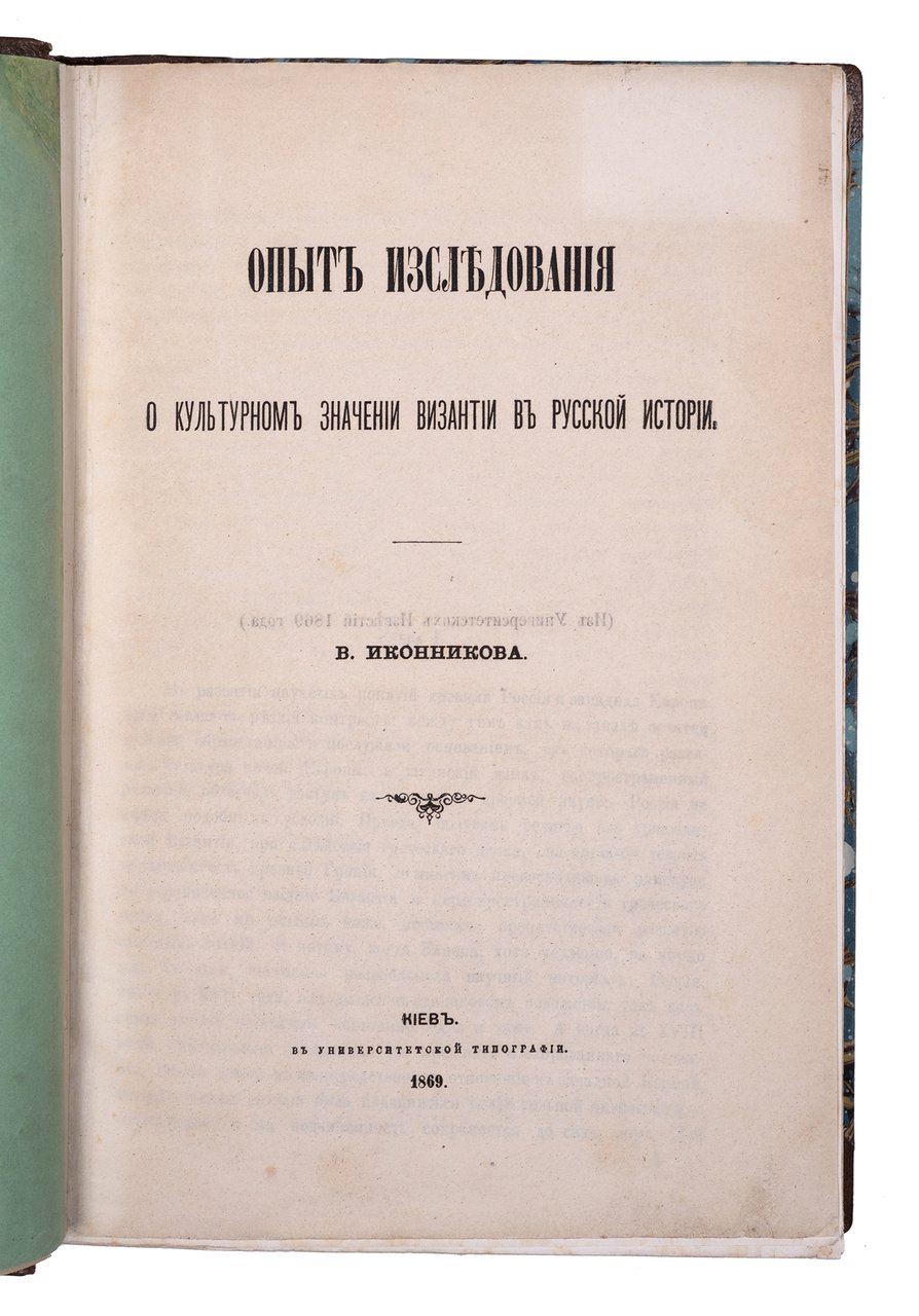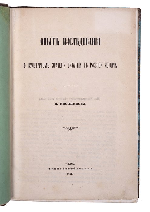 Иконников В. С. Опыт исследования о культурном значении Византии в русской истории. Киев: Университетская типография, 1869. [2], 562, X, 3 с. 26х17,5 см. В современном полукожаном переплете с мраморированными сторонками и золотым тиснением на корешке. Сохранена передняя сторонка издательской обложки. Лисьи пятна, реставрация обложки, ярлык частной библиотеки на обороте обложки, местами потемнение страниц. В остальном комплектный экземпляр в хорошем состоянии и подарочном переплете.