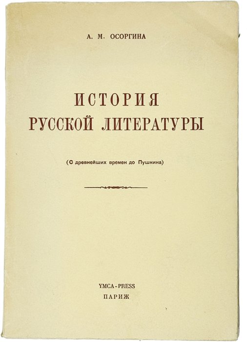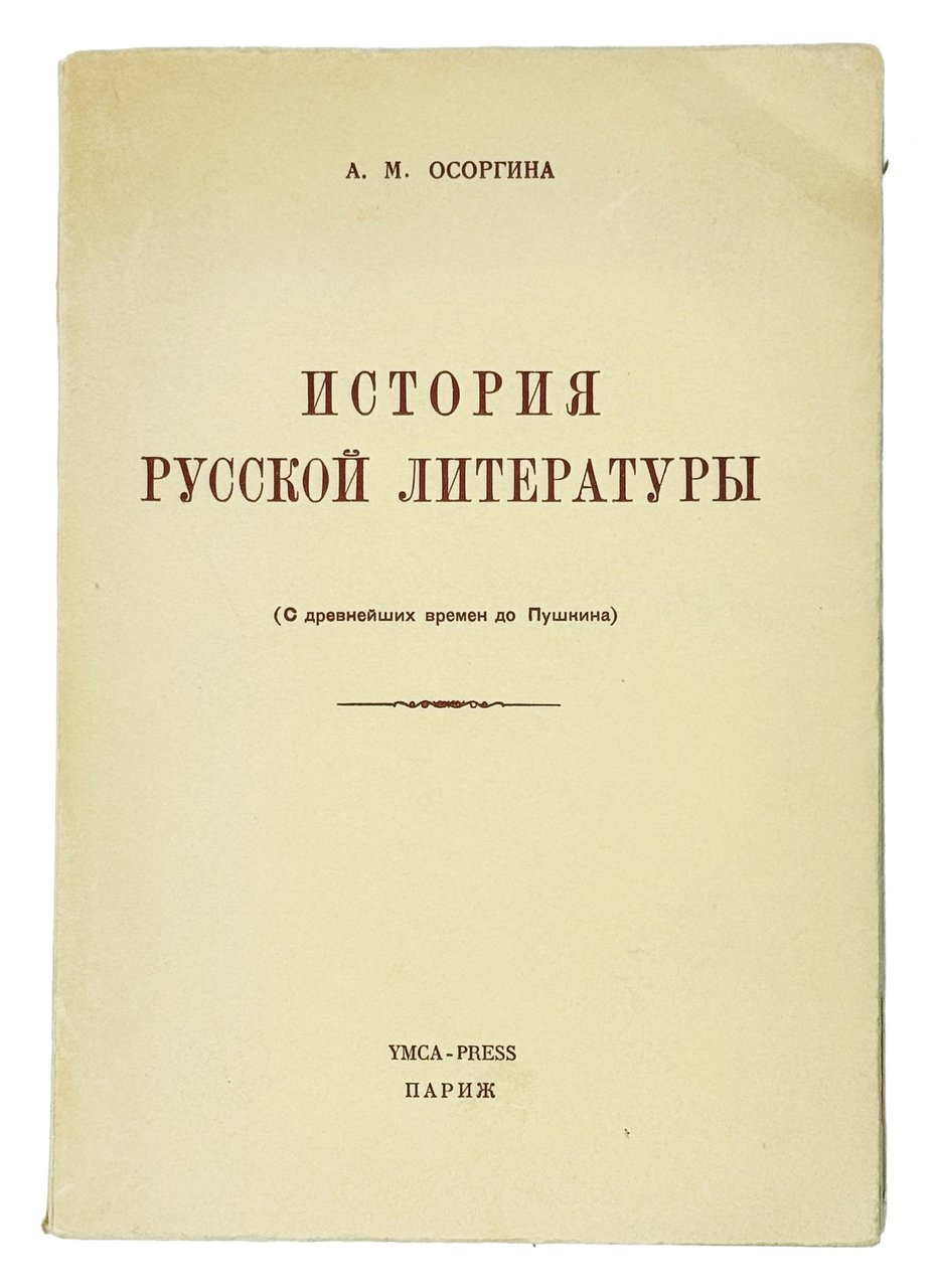 Осоргина А.М. История русской литературы: (С древнейших времен до Пушкина). Париж: YMCA-Press, 1945. 265 с. 23,5х16,5 см.