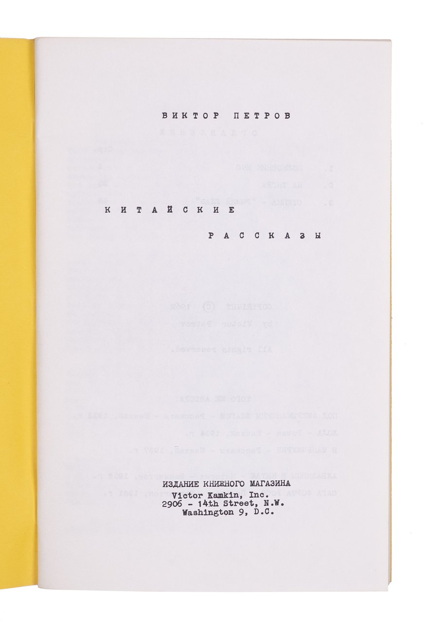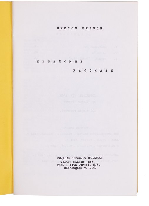 Петров В. Китайские рассказы. Вашингтон: Издание книжного магазина Victor Kamkin, 1962. [2], 58 с. 21х13,5 см.