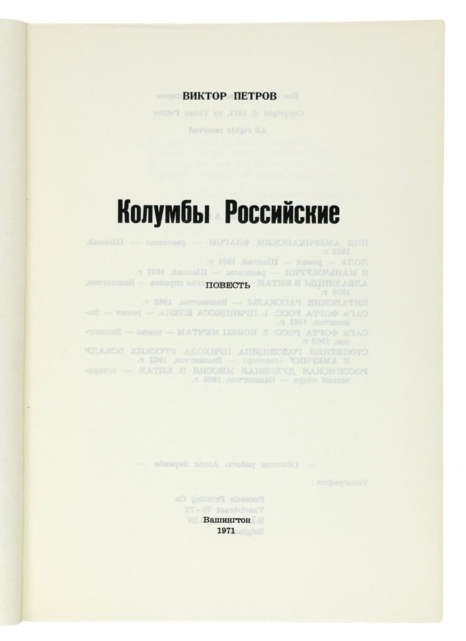 Петров В. Колумбы российские : Повесть. Вашингтон: Изд-во Виктора Ккамина, 1971. 196 с. 21х15 см.