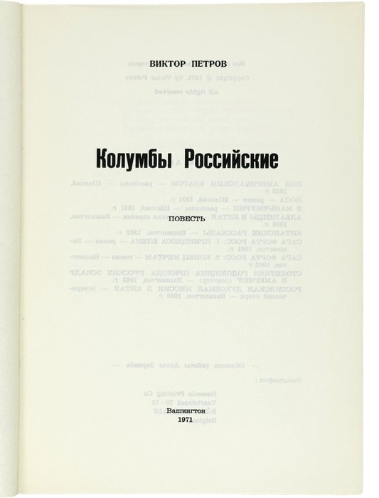 Петров В. Колумбы российские : Повесть. Вашингтон: Изд-во Виктора Камкина, 1971.