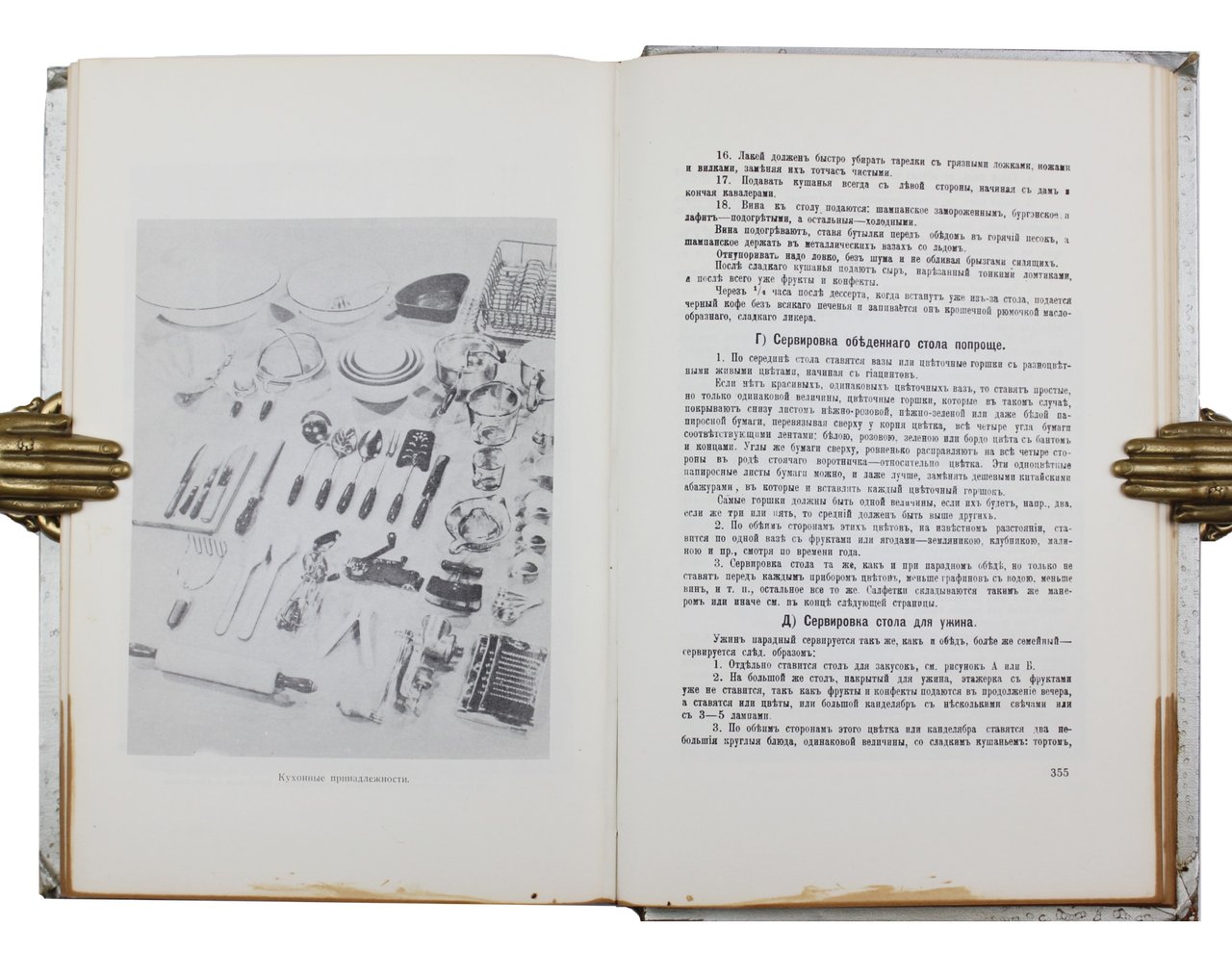 В тканевом переплете, покрытом серебряной краской, с золотистым курсивом и орнаментом, продублированными с сохраненной внутри обложки. Вышло без титульного листа. Пятна на полях страниц, преимущественно на нижнем, потертости переплета, редкие карандашные пометы, в остальном очень хорошая сохранность. Экземпляр содержит владельческие кулинарные газетные вырезки, наклеенные на форзац, а также вложенные в книгу.