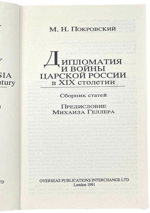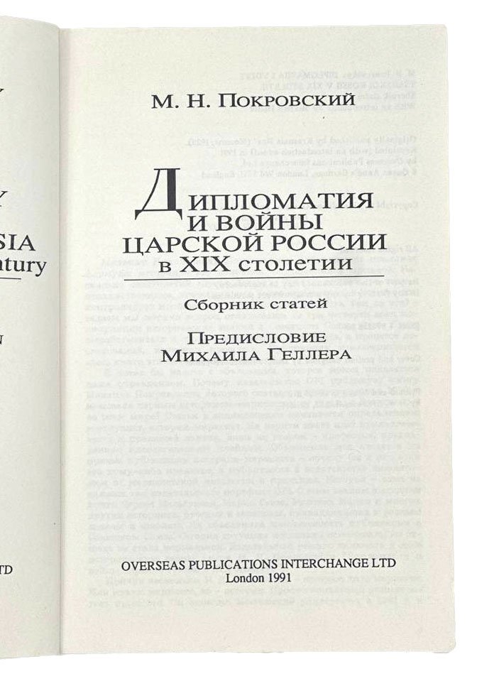 Покровский М.Н. Дипломатия и войны царской России в XIX столетии: Сборник статей. Лондон: OPI, 1991. 391 с. 18,5х12 см.