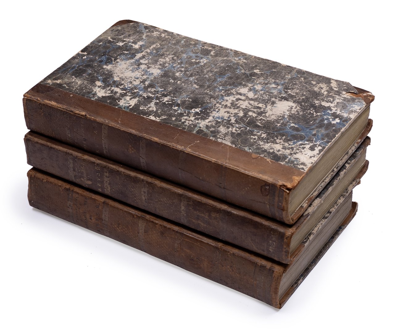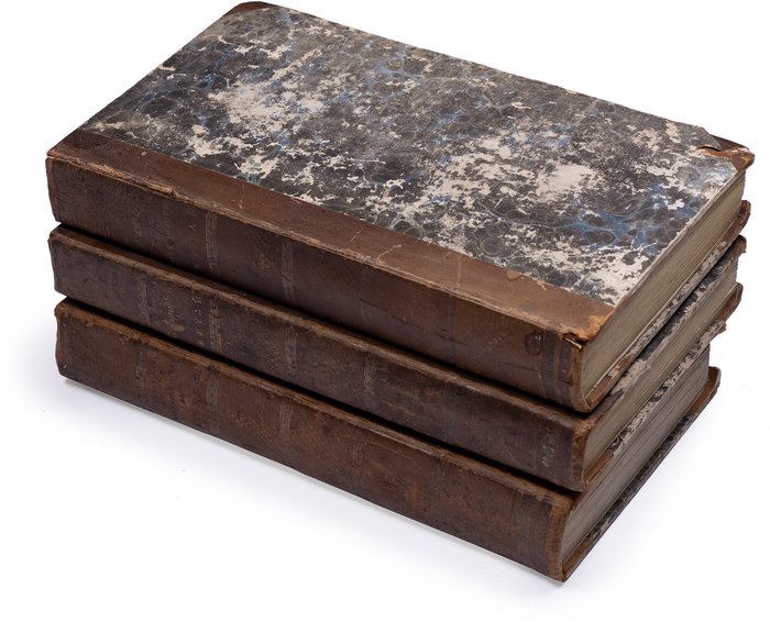 24х15 см. Три тома в полукожаных переплетах эпохи. Гравированные вклейки (иллюстрации, карты) работы резчиков Ивана Ческого, Андрея Ухтомского и др. В целом тома в хорошем состоянии. Потертости переплетов, сбитые уголки крышек, «лисьи» пятна; в части 3 трещины на форзацах. В первом томе на обороте передней крышки японский книготорговый ярлык. Сохранены 10 из 13-ти вклеек с иллюстрациями, включая все раскладные - обе карты («Чертеж российского монастыря и посольского двора в Пекине», «Карта пути от Кяхты до Пекина чрез Монголию Егора Тимковского») и план Пекина. В данном экземпляре отсутствуют 3 гравюры («Манжур в придворном платье» и «Манжурка» в Ч. 2,«Монгол Араши Тайцзи» в Ч. 3).