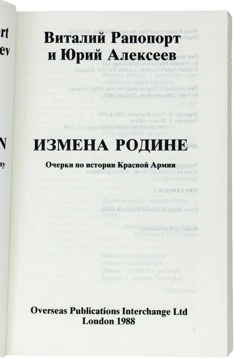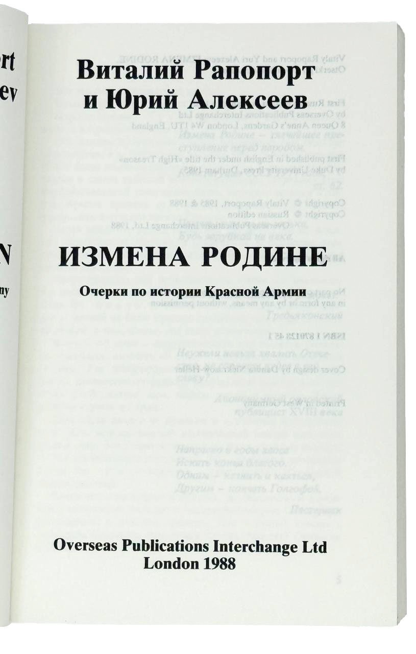 Рапопорт В., Алексеев Ю. Измена Родине: Очерки по истории Красной Армии. Лондон: OPI, 1988. 708 с. 18х12 см.