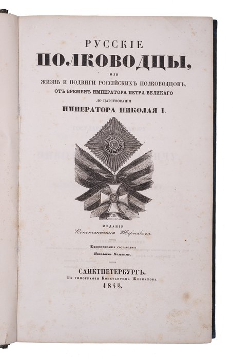 Полевой Н. А. Русские полководцы, или Жизнь и подвиги российских полководцев от времен императора Петра Великого до царствования императора Николая I : Жизнеописания, сост. Николаем Полевым. Санкт-Петербург: Изд. К. Жернакова, 1845. 1 л. фронт., II-XII, 353 с., 12 л. портр. 28х18,5 см. В составном переплете эпохи. Утрата 2 с. оглавления в конце, реставрация переплета, мелкие лисьи пятна, загрязнения от перелистывания. В остальном хорошее состояние. Провенанс: из частной профессорской библиотеки в США, штамп владельца на обороте задней крышки.