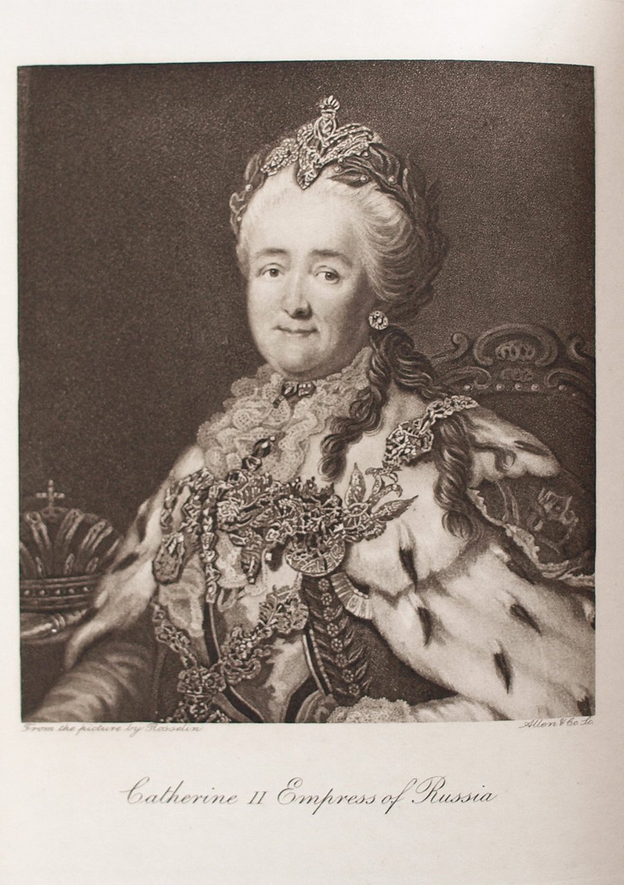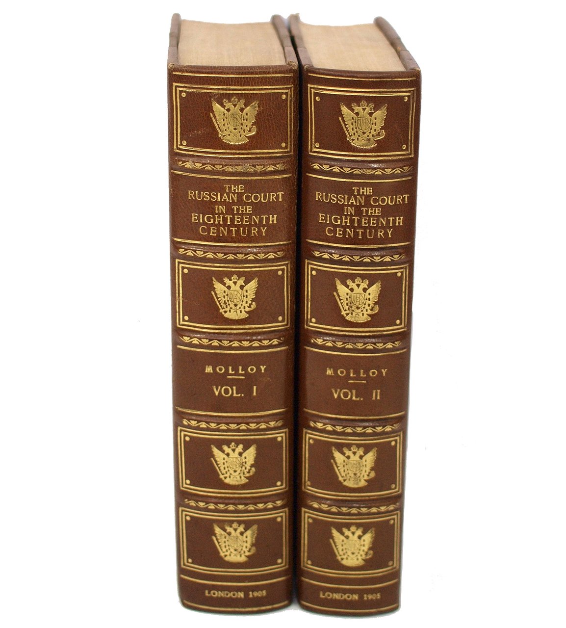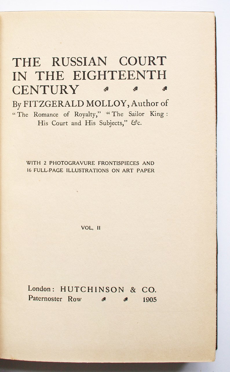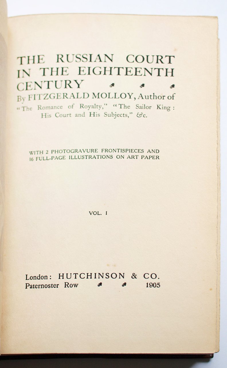 Molloy F. Russian court in 18th century [Русский императорский двор в XVIII веке]. London: Hutchinson & Co, 1905. Т. 1: XII, [2], 318 c., 8 л. ил.; Т. 2: X, [2], 319-597 с., 10 л. ил. 22x15 см.