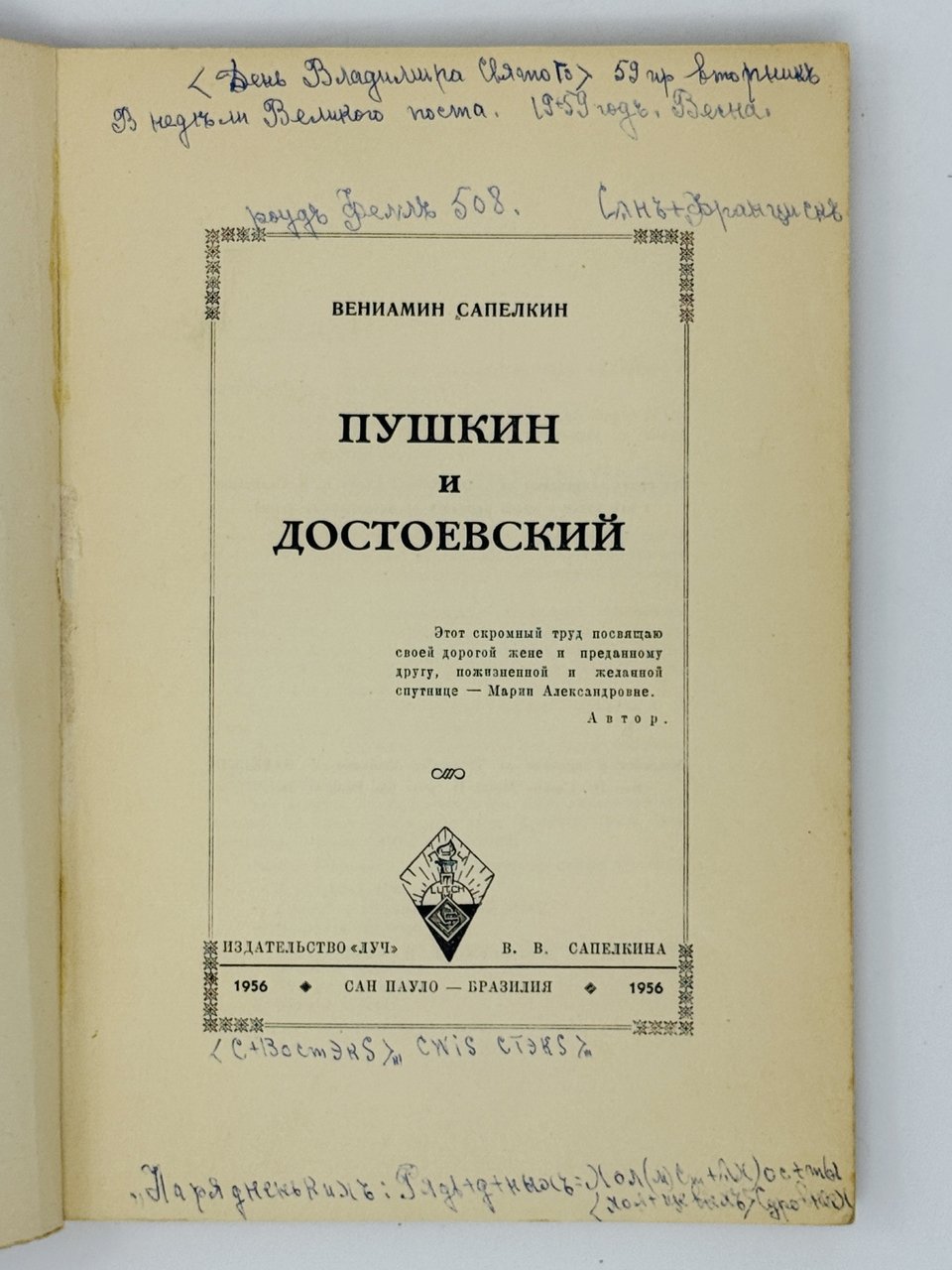 Сапелкин В. Пушкин и Достоевский. Сан-Пауло: Луч, 1956.