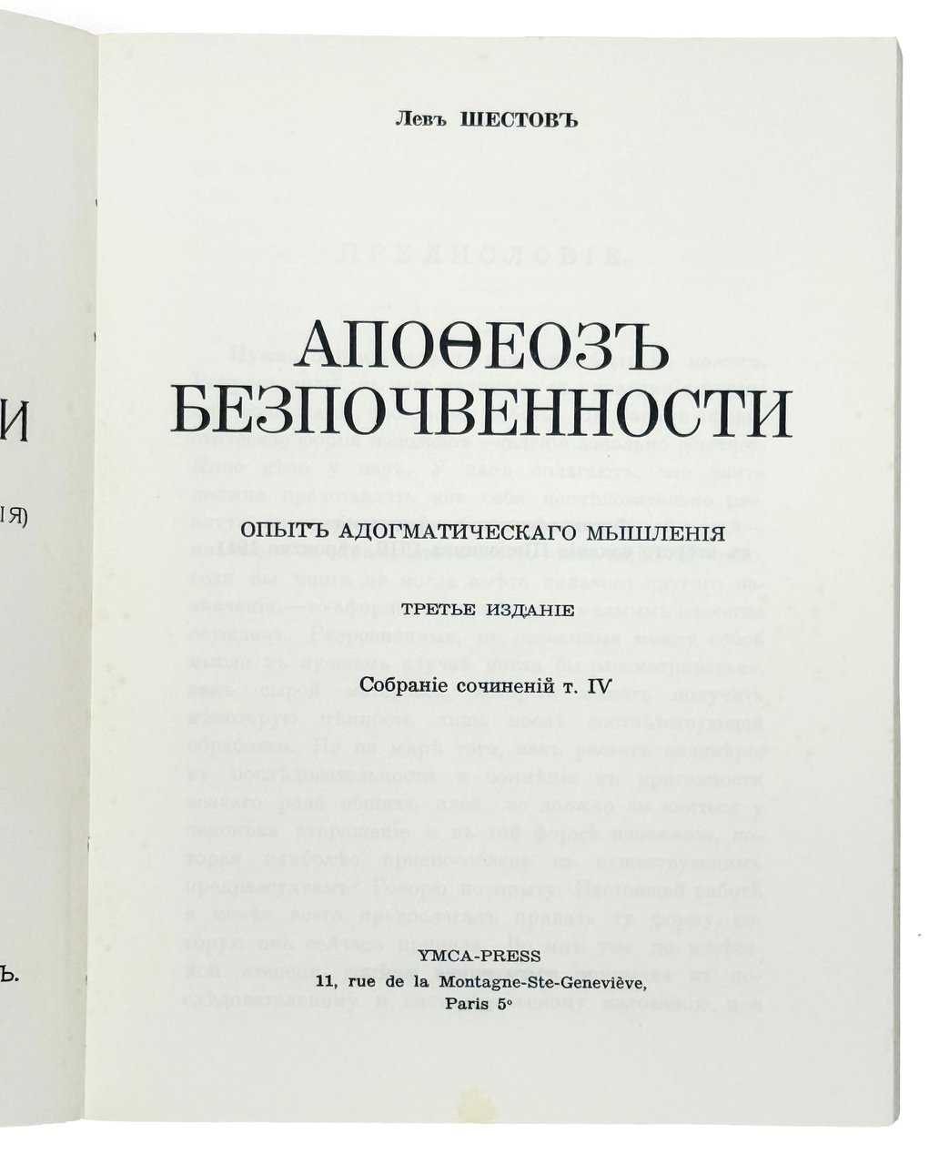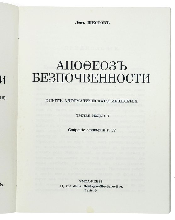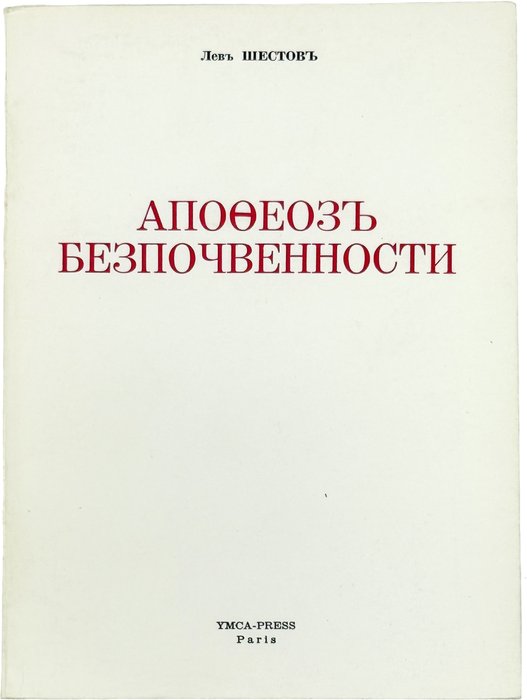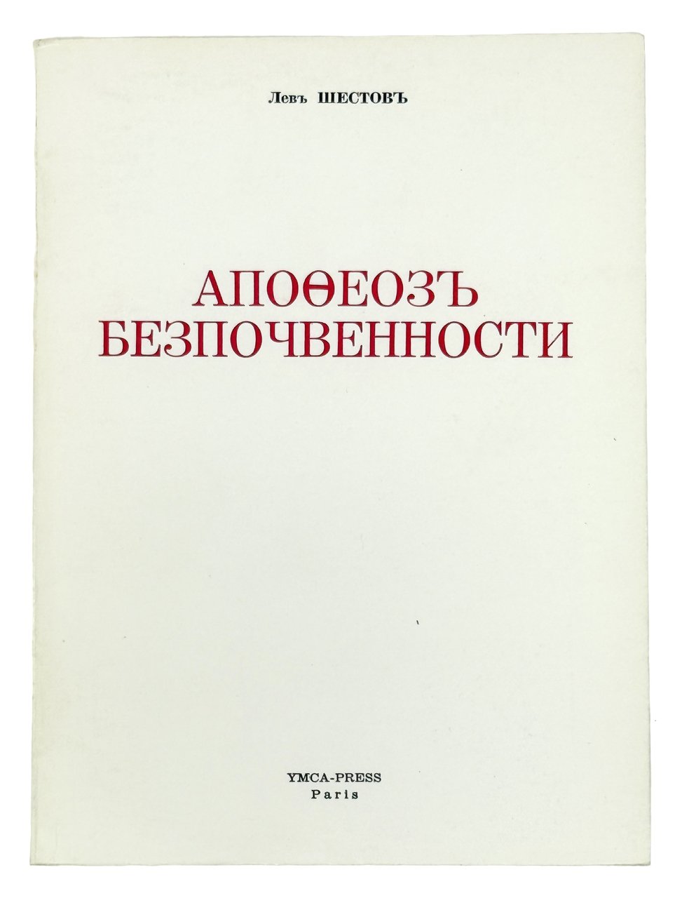 Шестов Л. Апофеоз беспочвенности: Опыт адогматического мышления. Париж: YMCA-Press, 1971. 300, [2] с. 18х14 см.