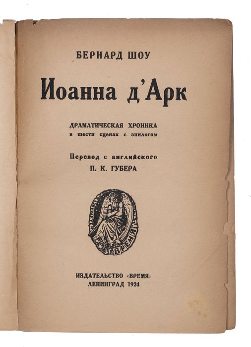 Шоу Б. Иоанна д'Арк: Драматическая хроника в шести сценах с эпилогом. Ленинград: Время, 1924. 242, [2] с. 20х14 см.