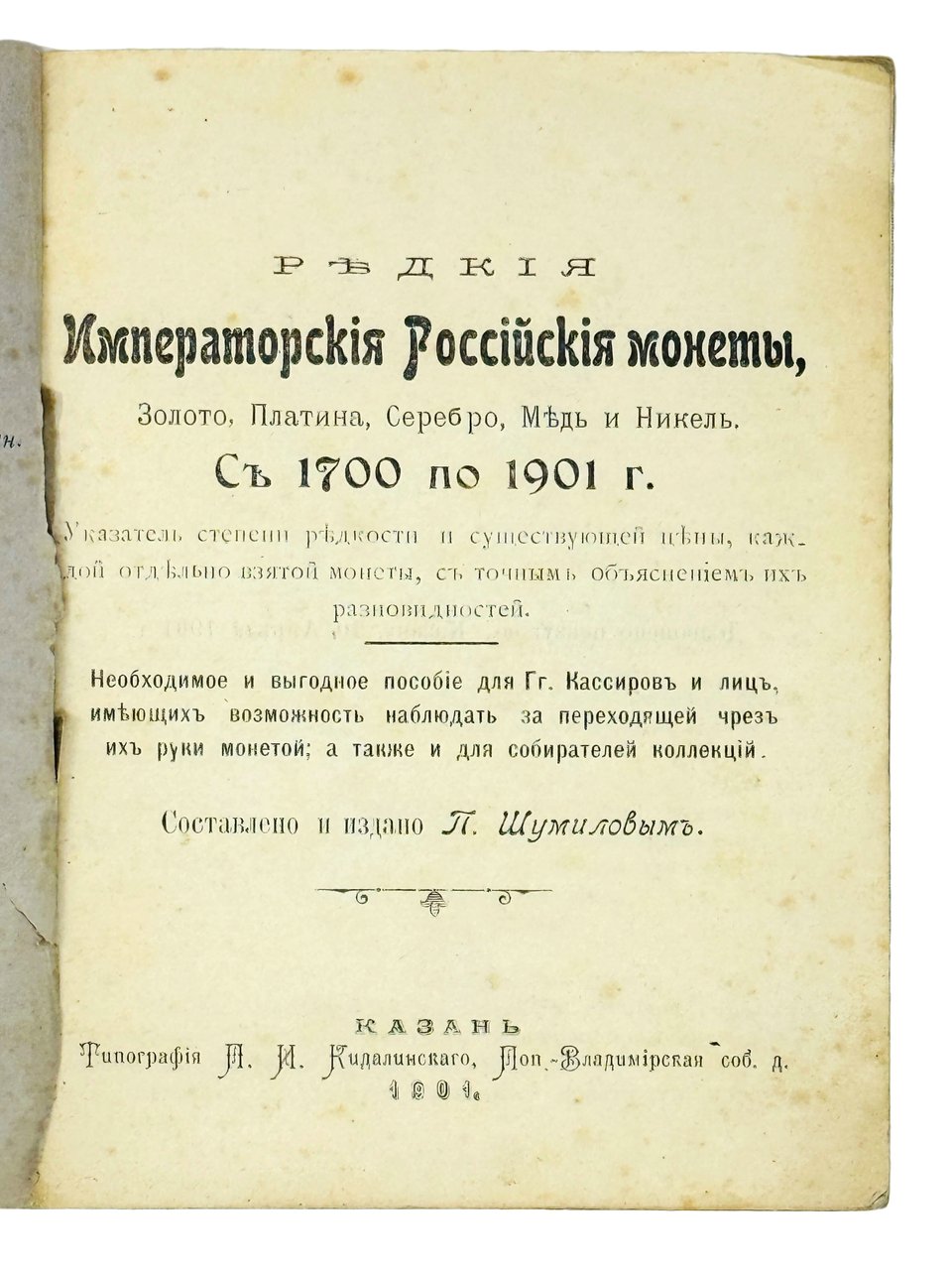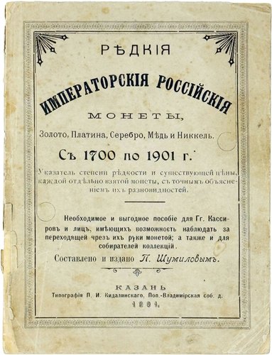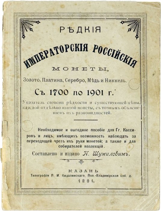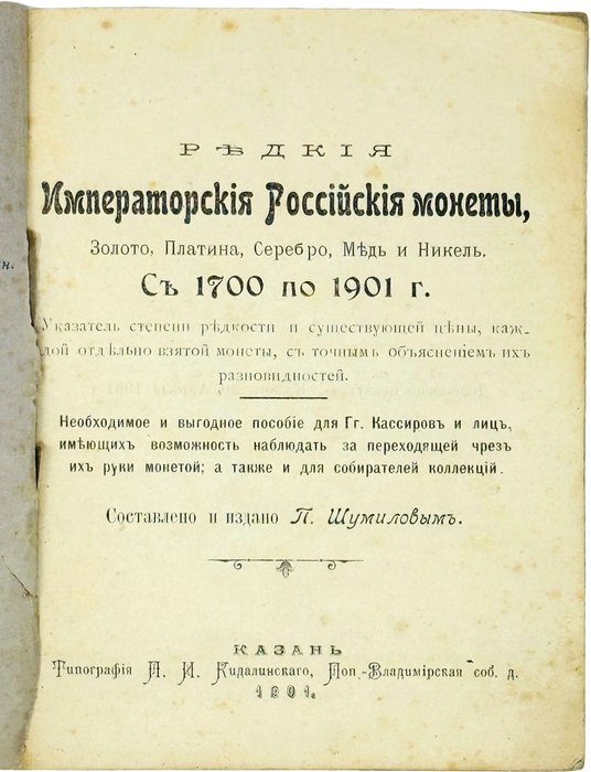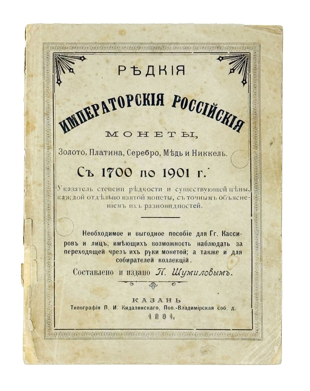 Шумилов П. Редкие императорские российские монеты: С 1700 по 1901 год. Казань: Тип. П.И. Кидалинского, 1901. [2], III, 58 с.: табл. 15,5х12 см.