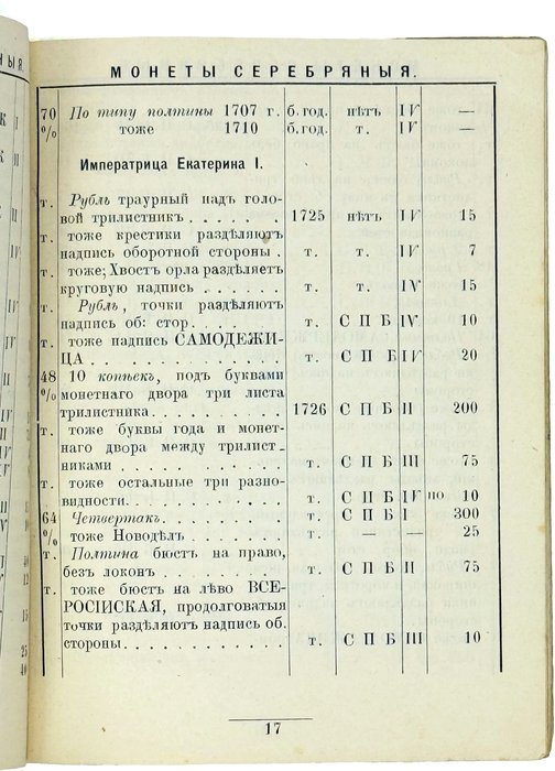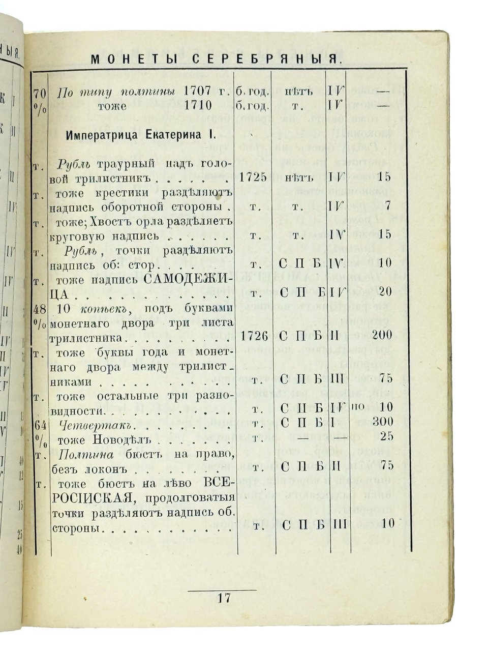 Редкое нумизматическое пособие. Включает хронологическую таблицу с указанием редкости, цены и различных характеристик монет. Указатель предваряется практическими советами собирателям, в которых, среди прочего рекламируются составленные П. Шумиловым справочники с адресами других собирателей.