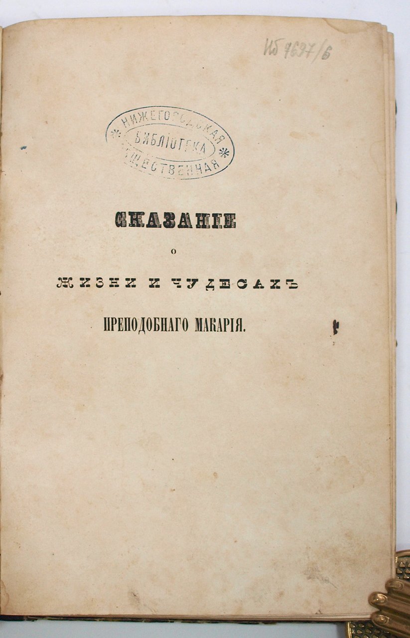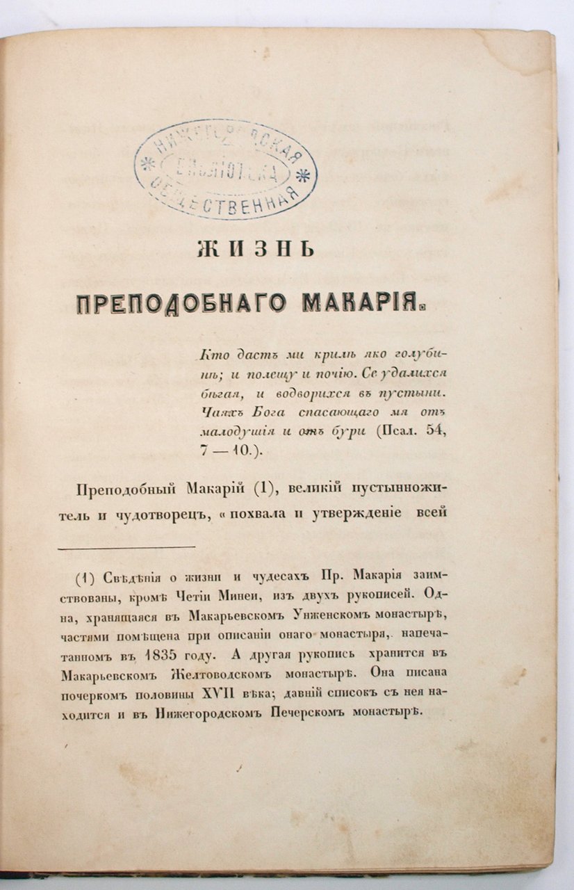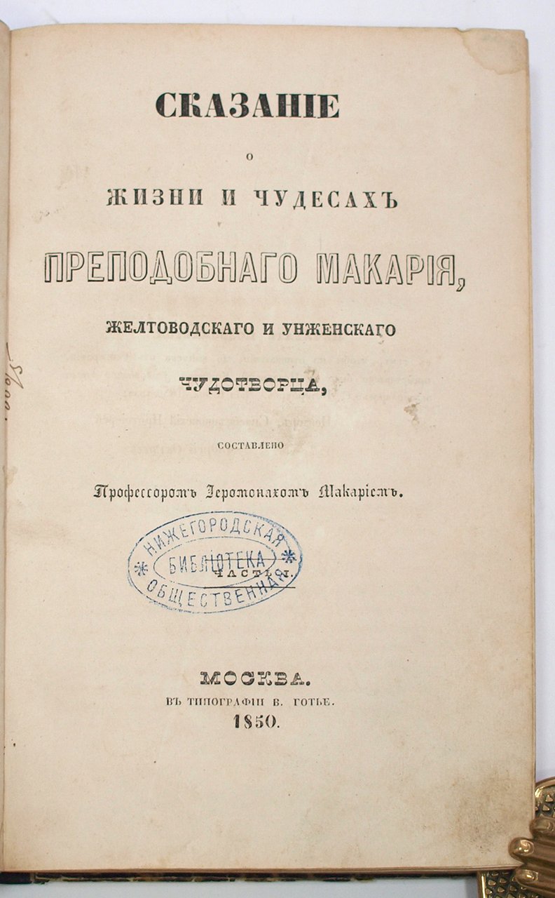 1) Сказание о жизни и чудесах преподобного Макария, желтоводского и унженского чудотворца: в 2-х ч. / Сост. профессором иеропонахом Макарием. М.: Тип. В. Готье, 1850. 70 с.